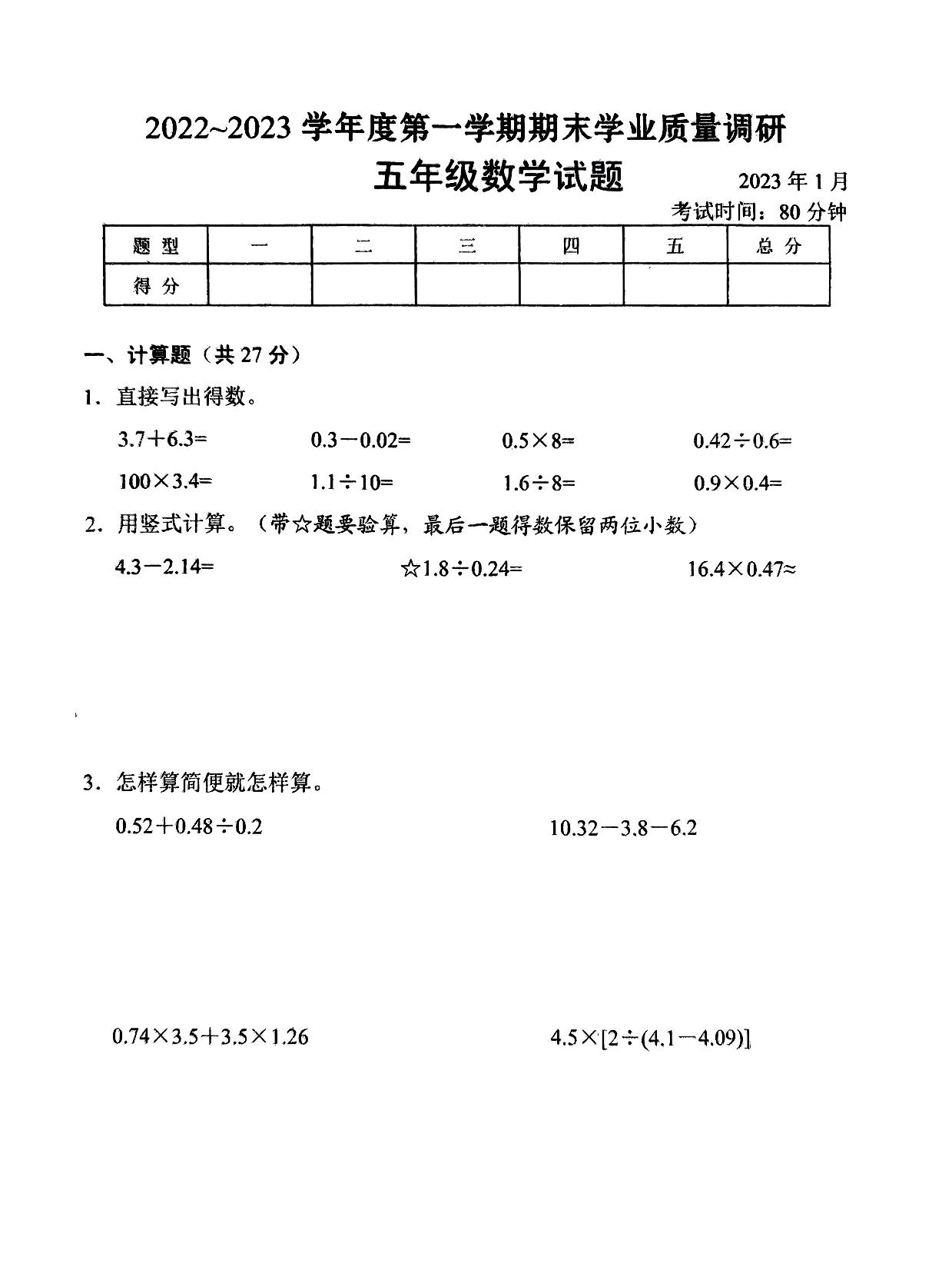 江苏省常州市溧阳市2022-2023学年度第一学期期末学业质量调研试题五年级数学(苏教版)