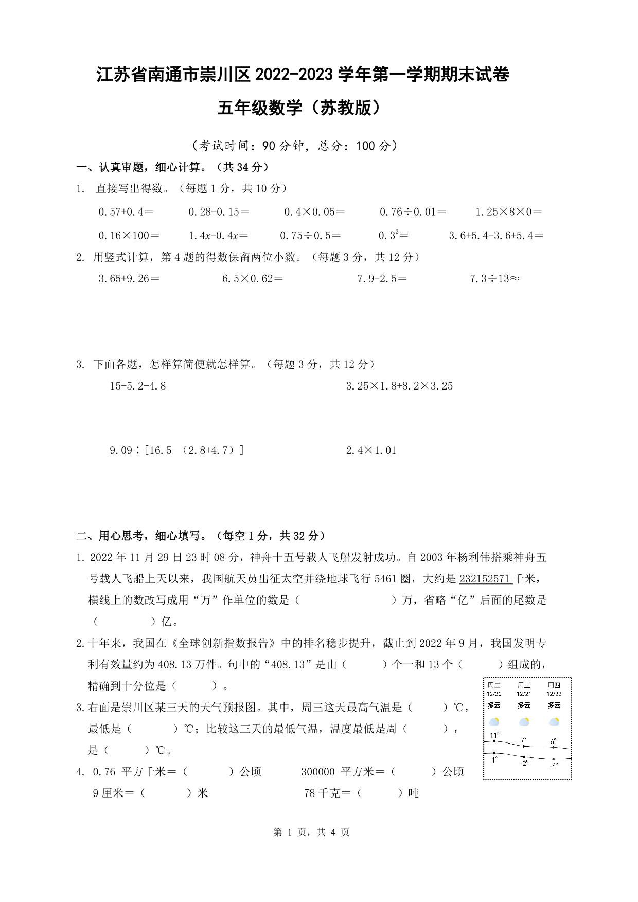 江苏省南通市崇川区2022-2023学年第一学期期末试卷五年级数学(苏教版)