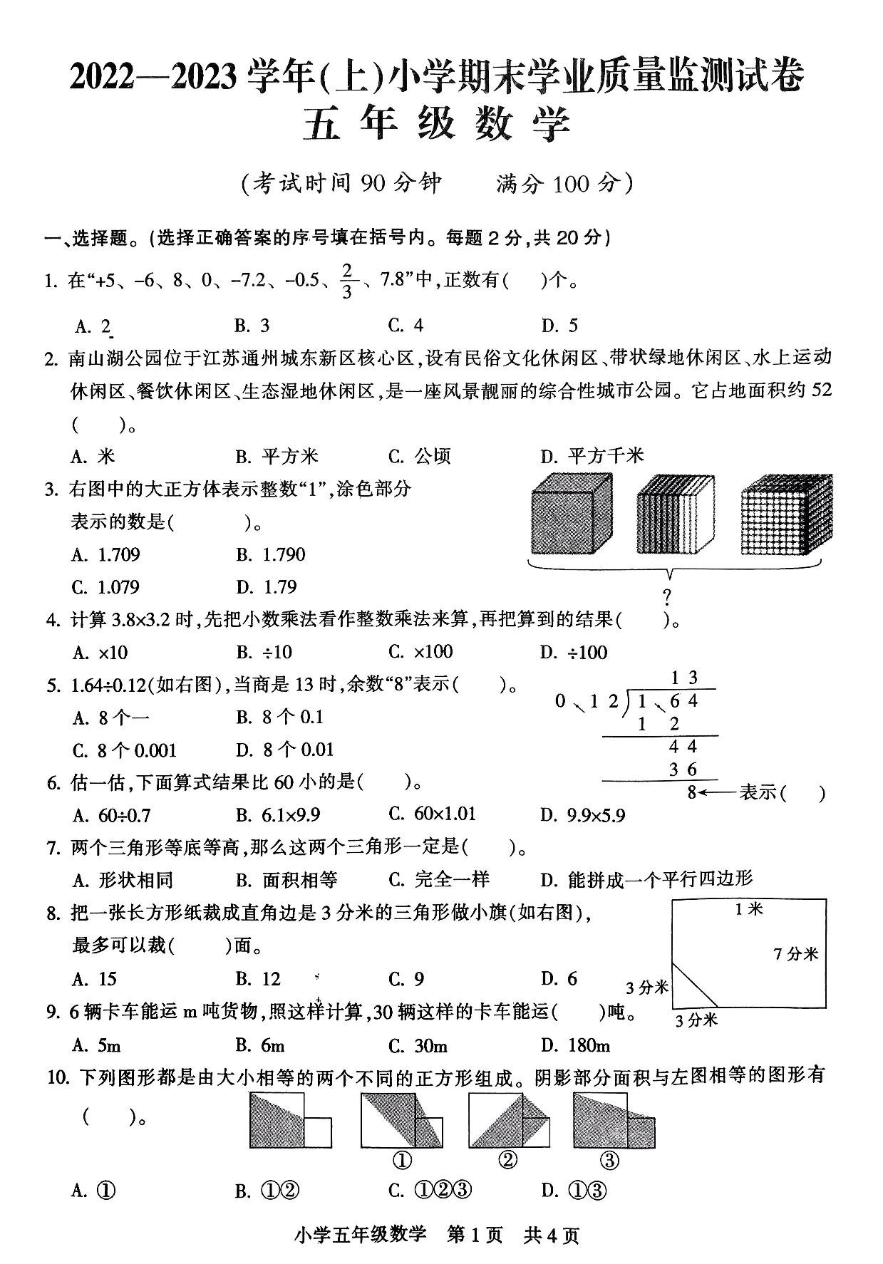 江苏省南通市通州区2022-2023学年(上)小学期末学业质量检测试卷五年级数学(苏教版)