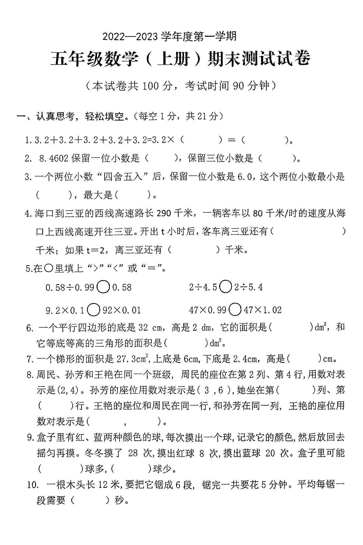 江苏省常州市武进区2022-2023学年度第一学期期末测试试卷五年级数学(苏教版)
