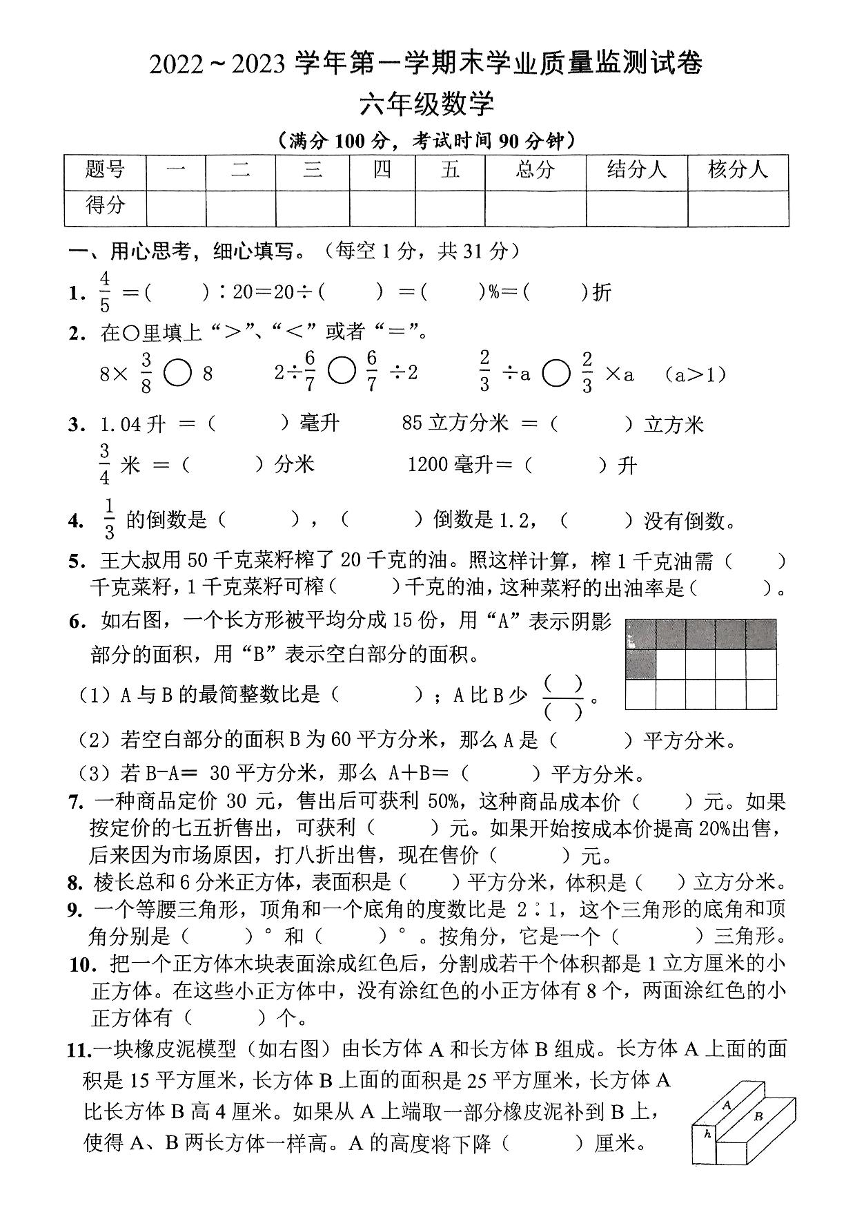 江苏省南通市海安市2022-2023学年第一学期期末学业质量监测试卷六年级数学(苏教版)