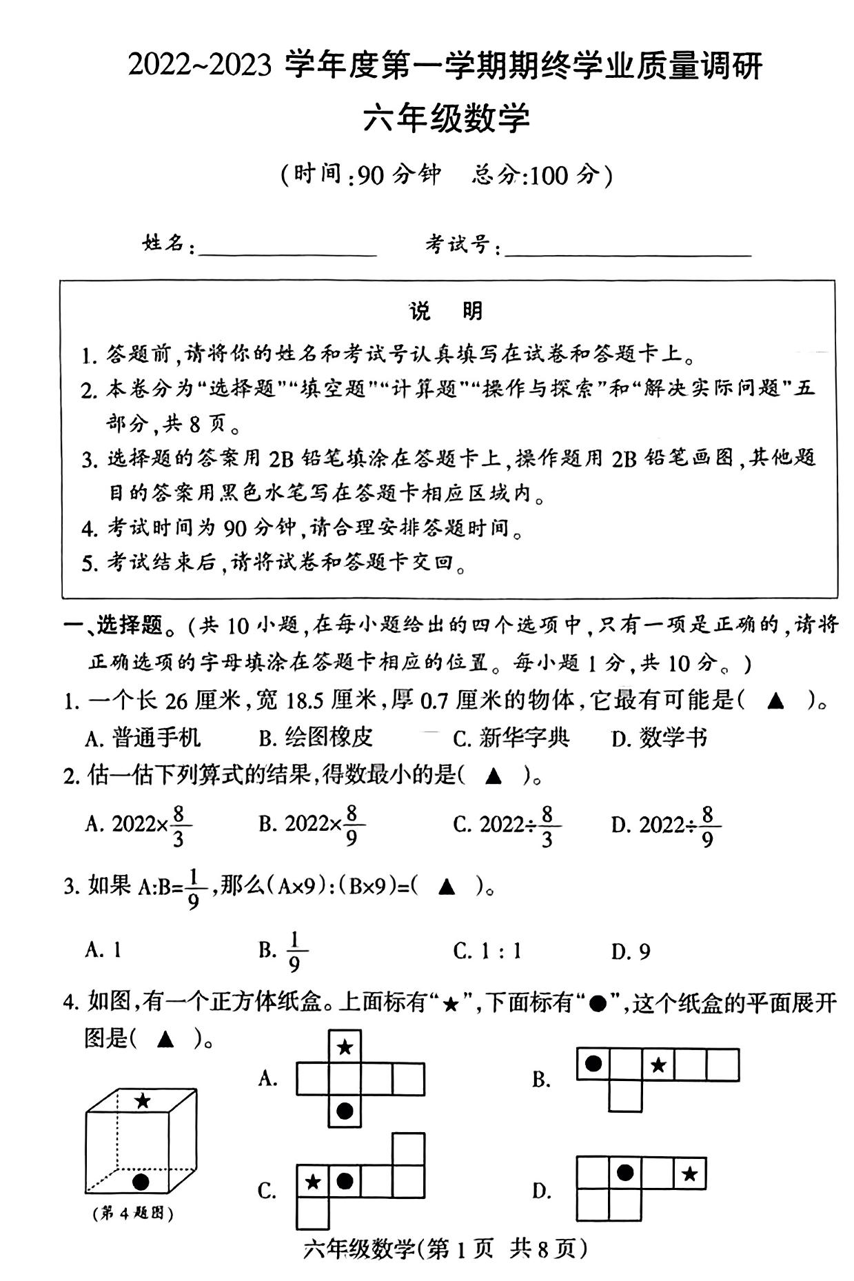 江苏省南通市海门区2022-2023学年度第一学期期终学业质量调研六年级数学(苏教版)