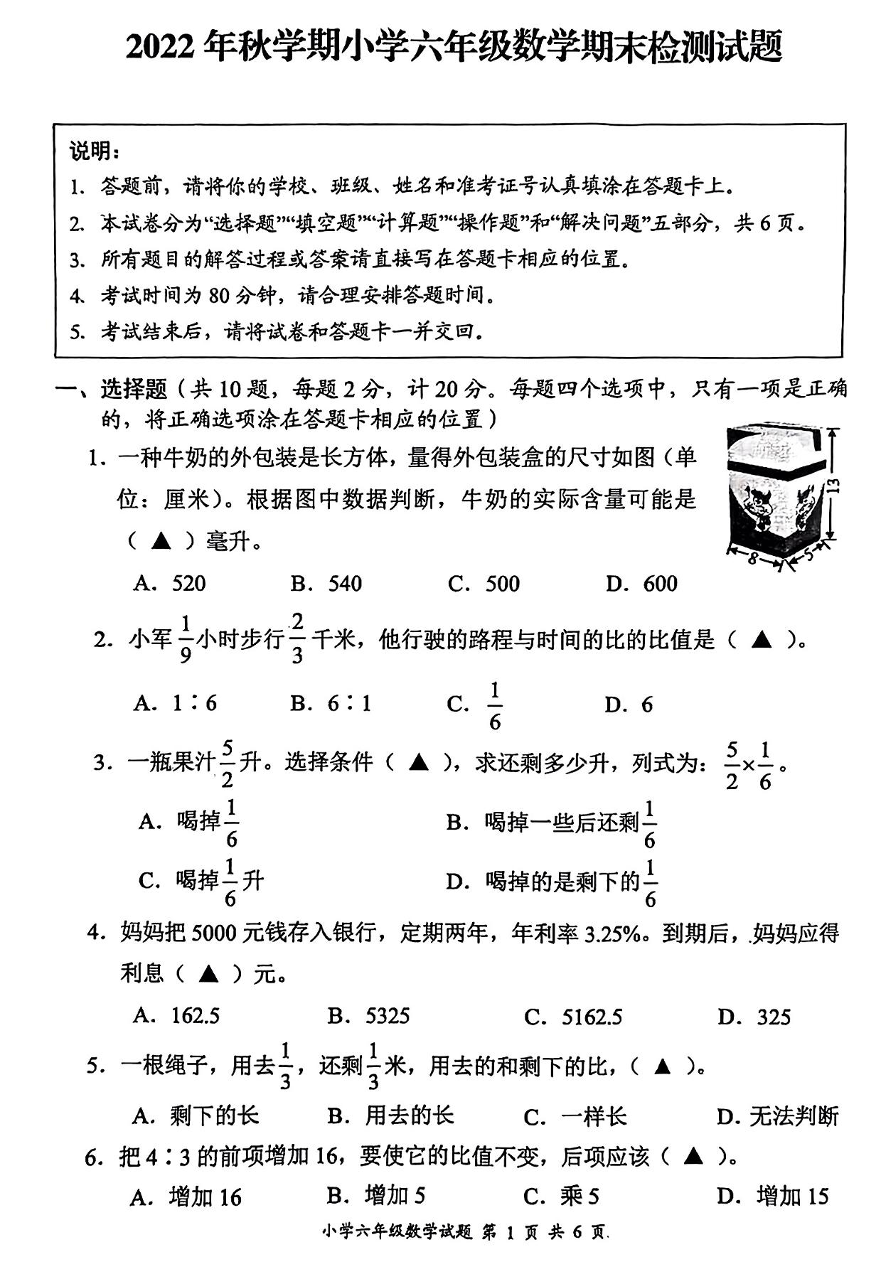江苏省盐城市大丰区2022年秋期小学期末检测试题六年级数学(苏教版)