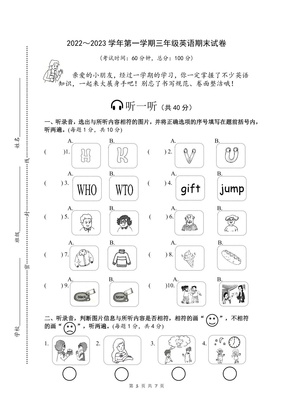 江苏省南通市崇川区2022-2023学年第一学期期末试卷三年级英语(译林版)【无听力音频】