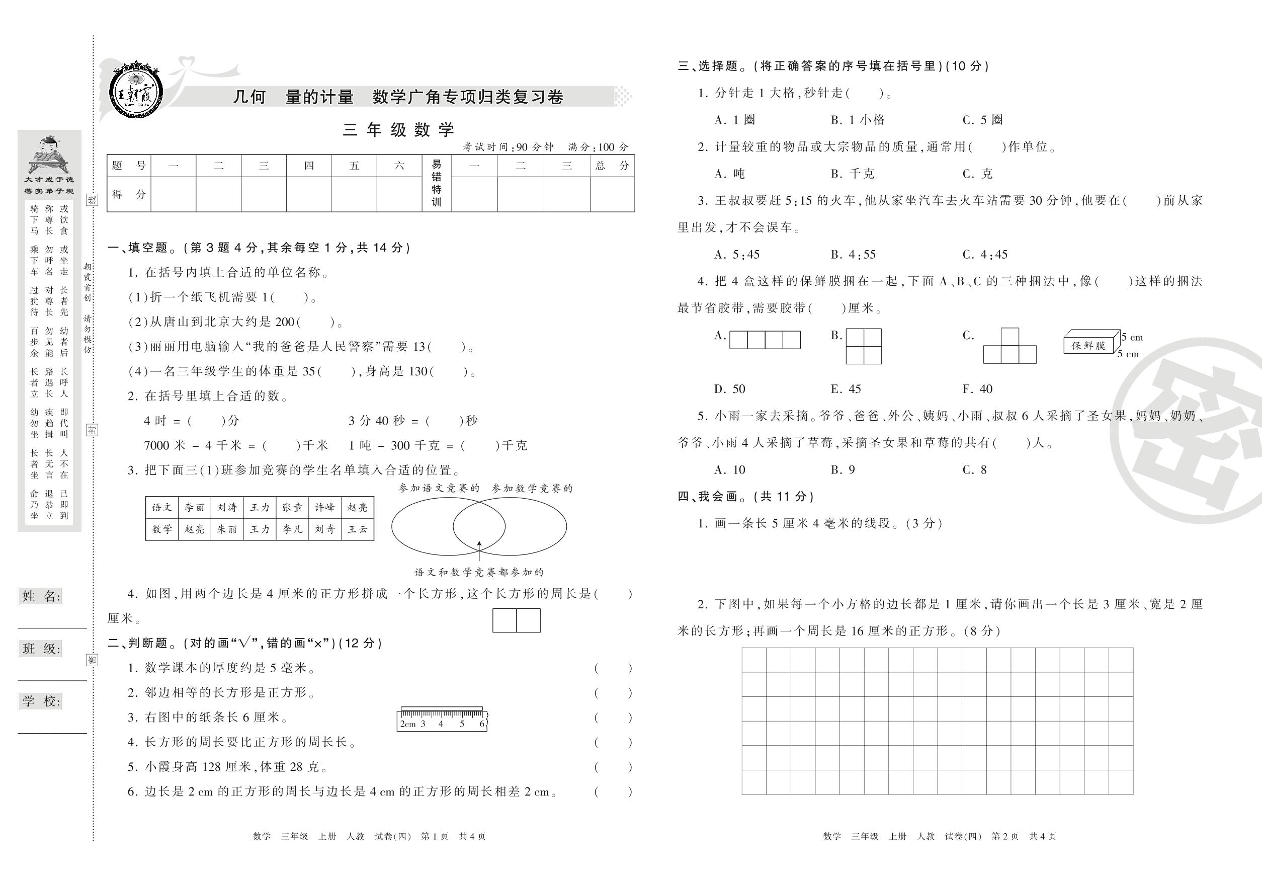 王朝霞期末专项卷——几何 量的计量 数学广角专项归类复习三年级上册数学(人教版)【0】