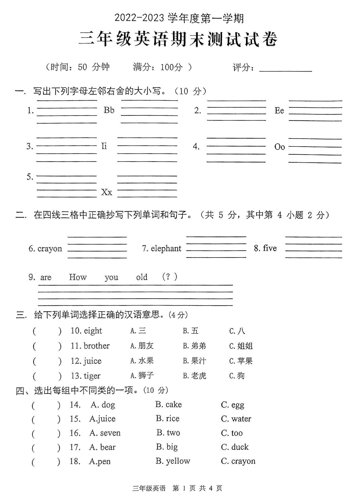 江苏省常州市武进区2022-2023学年度第一学期期末测试试卷三年级英语(译林版)【无听力音频】