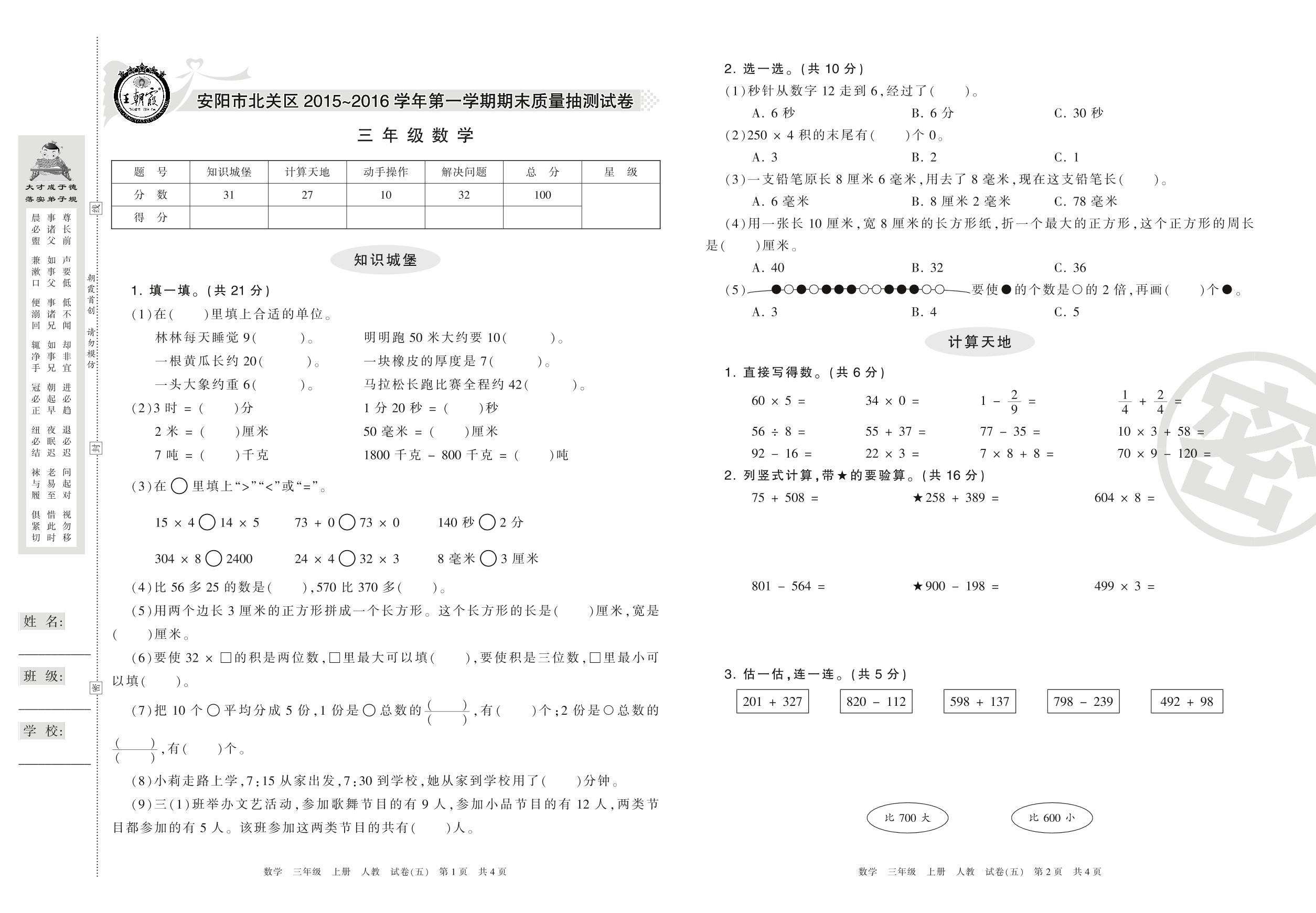 2015-2016学年第一学期安阳市北关区三年级数学试卷(人教版)【5】