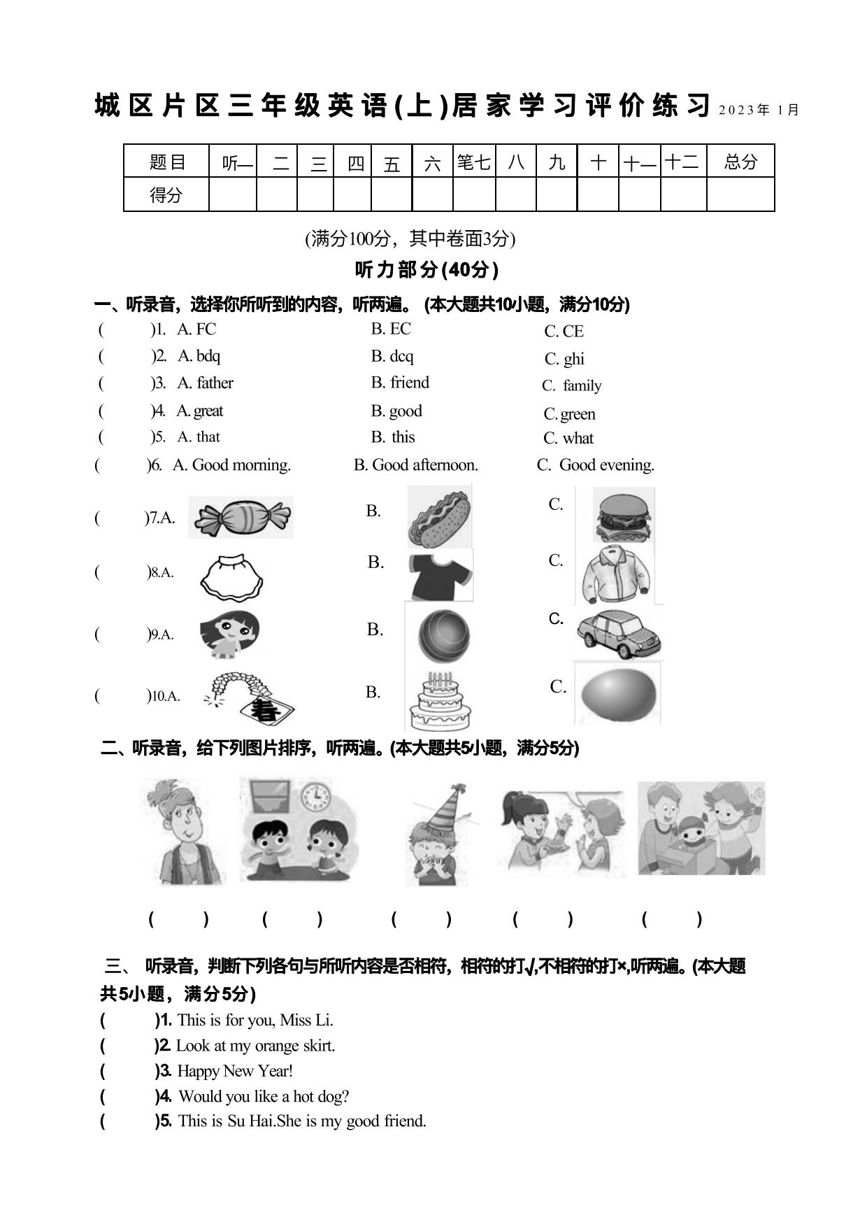 江苏省泰州市兴化市城区片区2022-2023学年(上)期末居家学习评价练习三年级英语(译林版)【无听力音频】