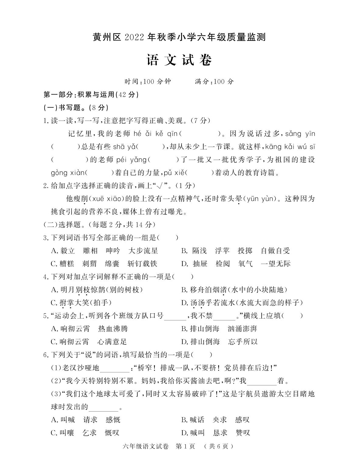 湖北省黄冈市黄州区2022年秋季小学期末质量监测试卷六年级语文(人教版)
