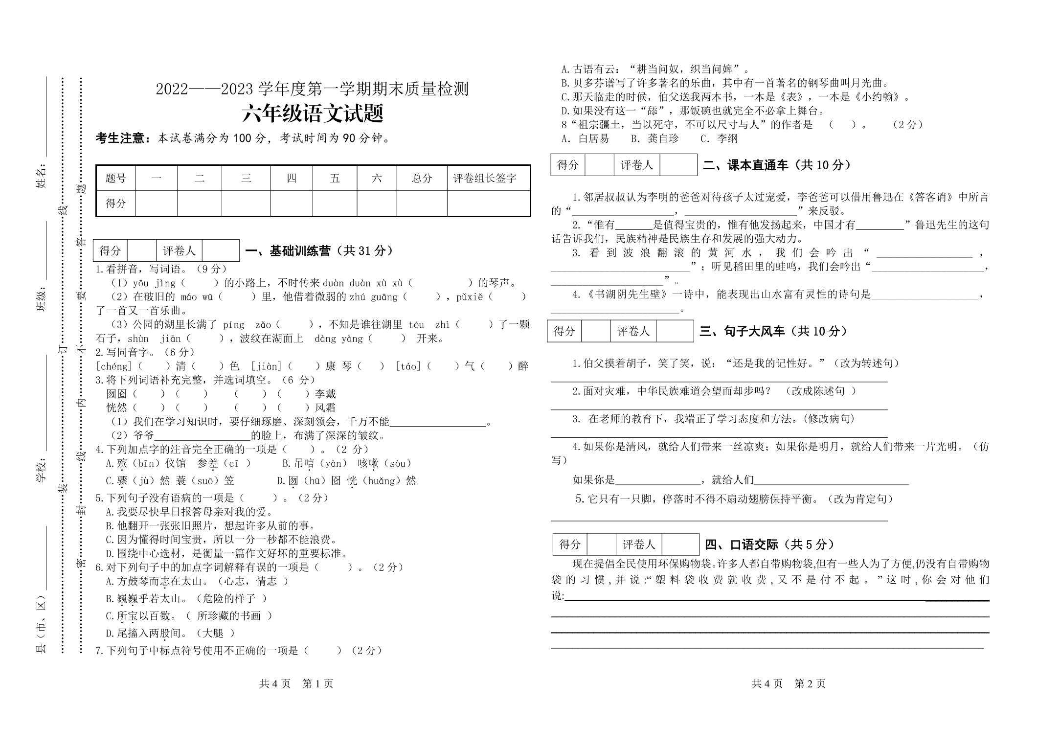 甘肃省定西市安定区思源实验学校2022-2023学年度第一学期期末质量检测试题卷六年级语文(人教版)