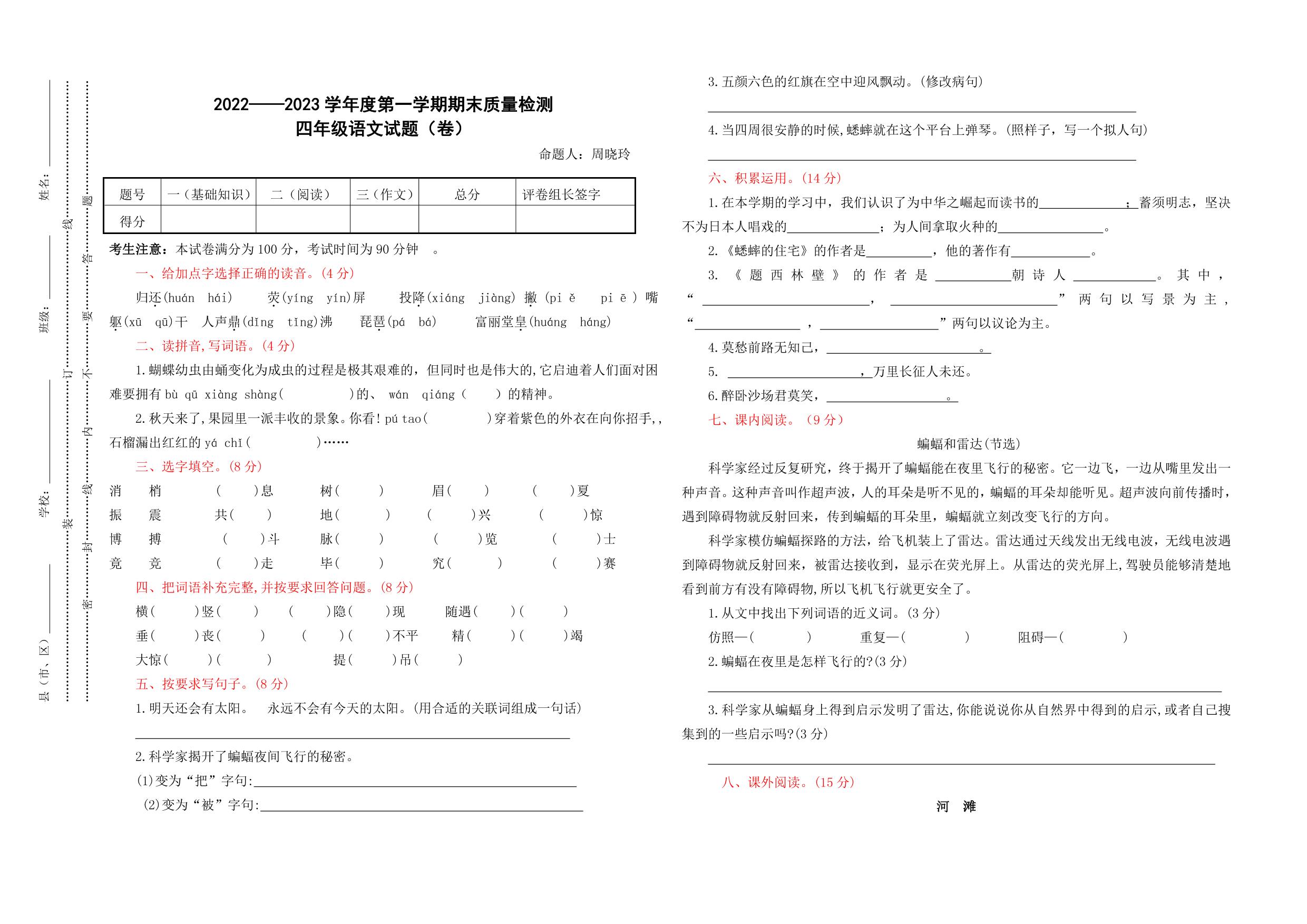 甘肃省定西市安定区思源实验学校2022-2023学年度第一学期期末质量检测试题卷四年级语文(人教版)