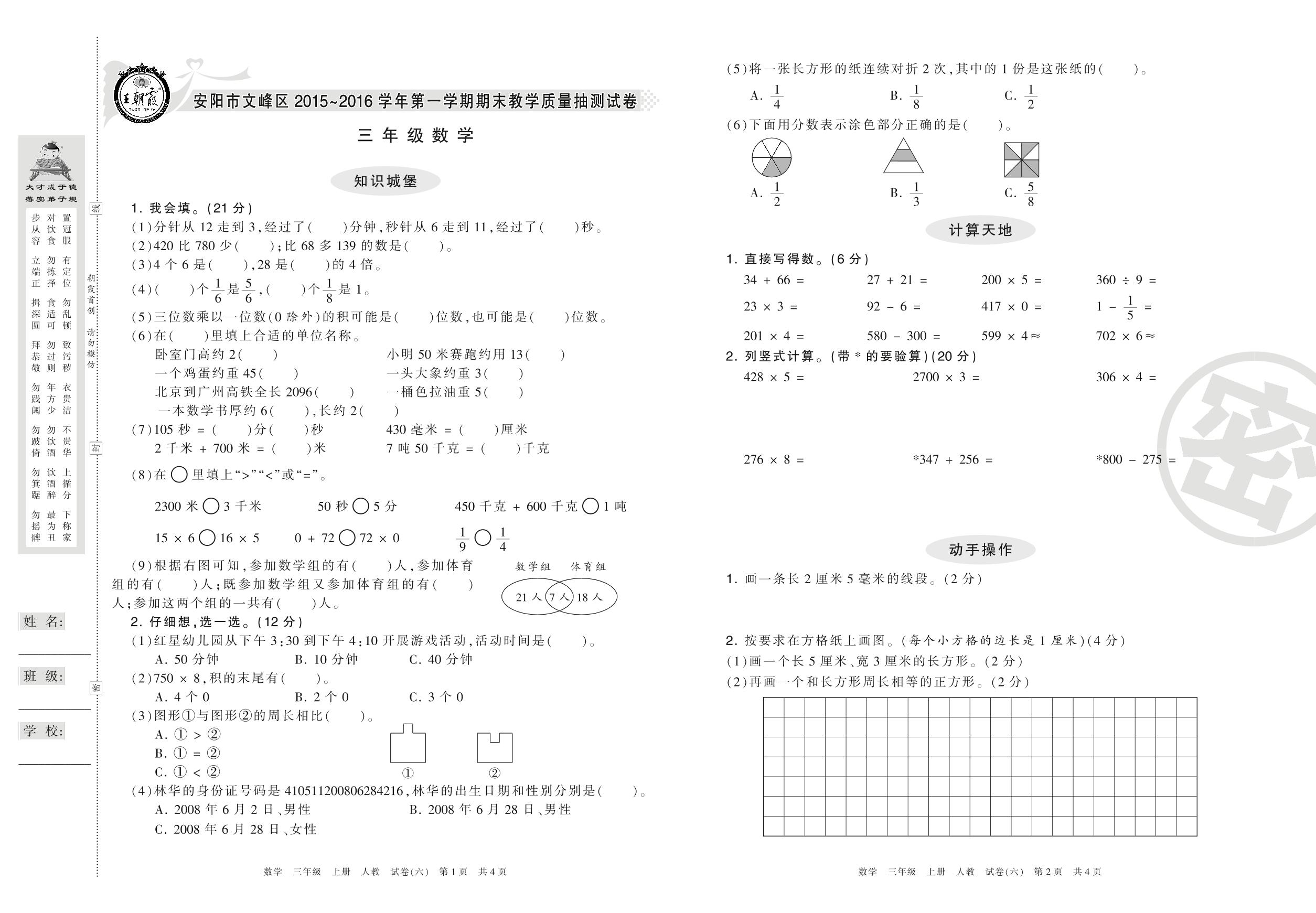 2015-2016学年第一学期安阳市文峰区三年级数学试卷(人教版)【6】