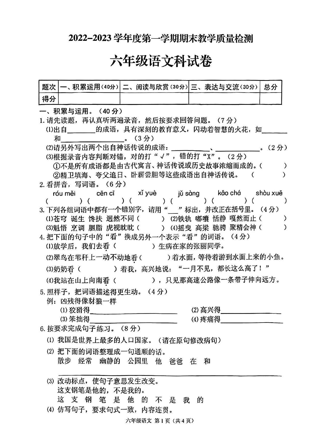 广东省潮州市潮安区2022-2023学年度第一学期期末教学质量检测试卷六年级语文(人教版)