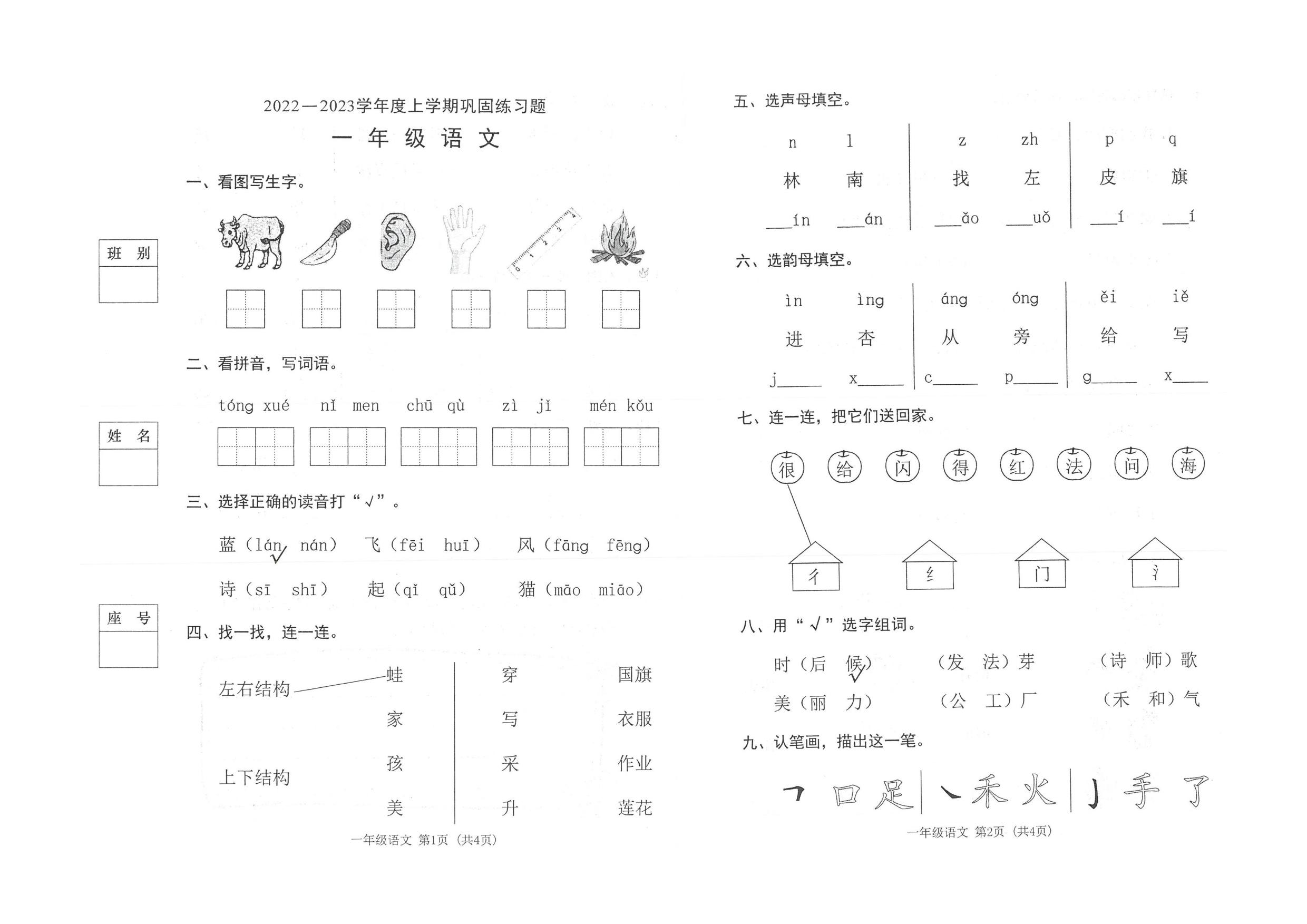 广东省东莞市2022-2023学年度上学期期末巩固练习题一年级语文(人教版)