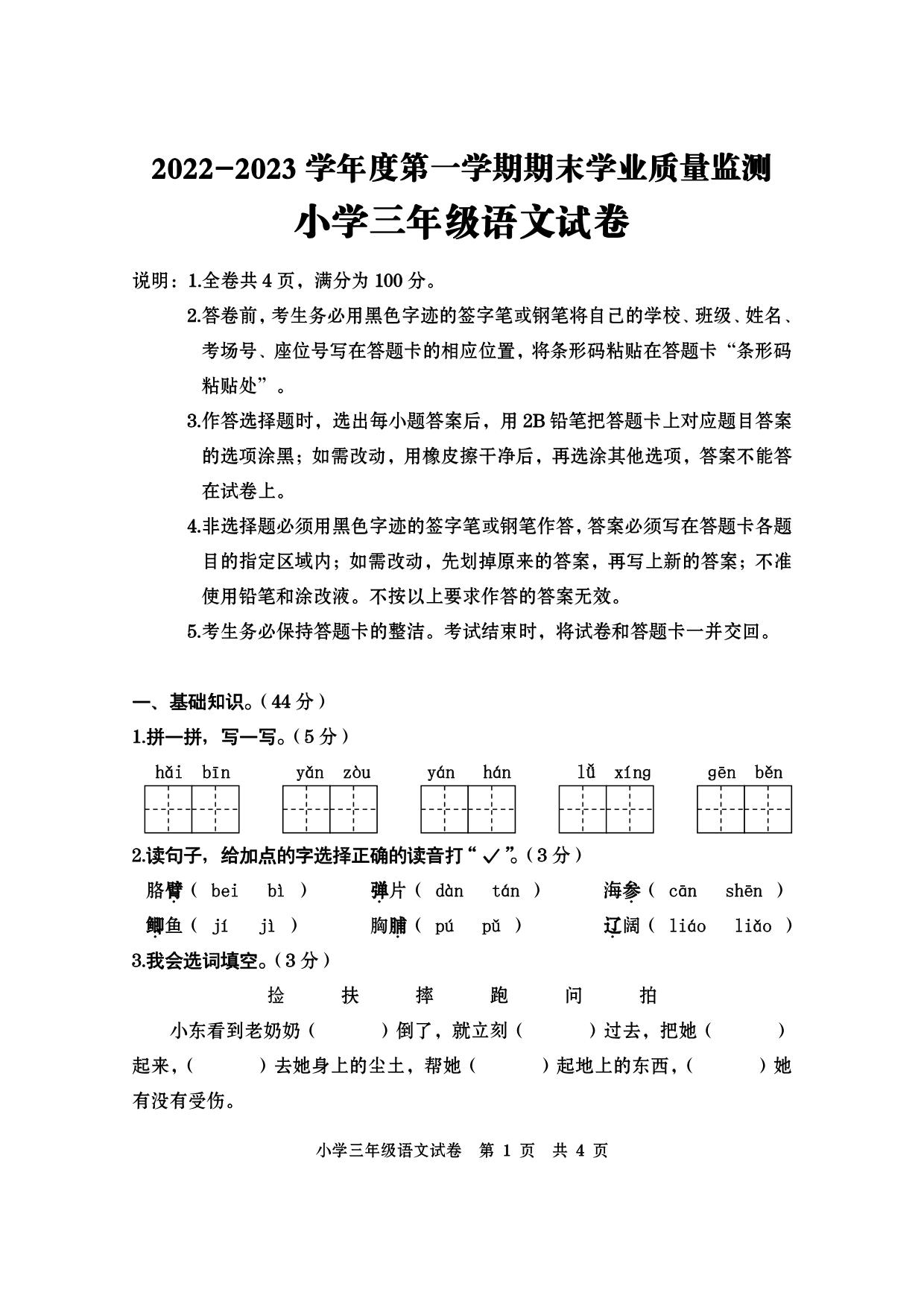 广东省汕尾市海丰县2022-2023学年度第一学期期末学业质量监测试卷三年级语文(人教版)