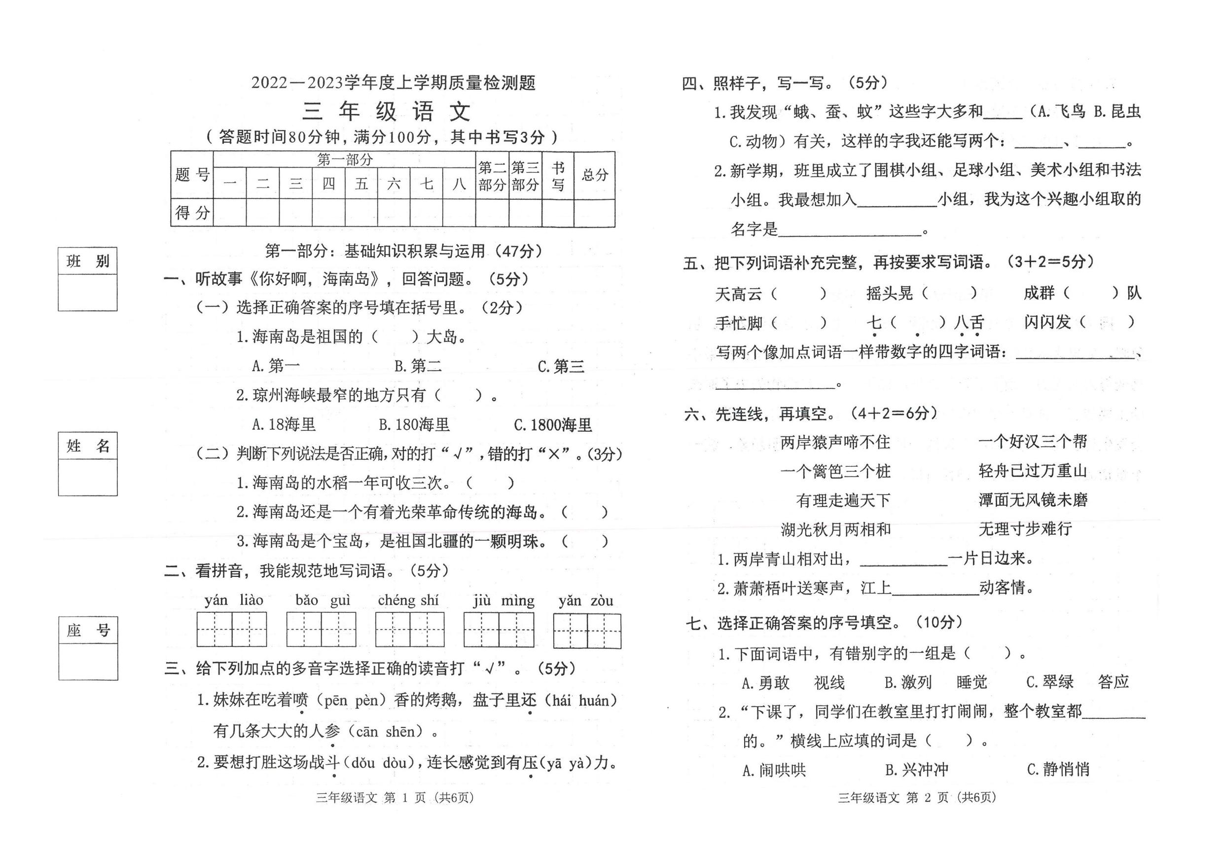 广东省东莞市2022-2023学年度上学期期末质量检测题三年级语文(人教版)