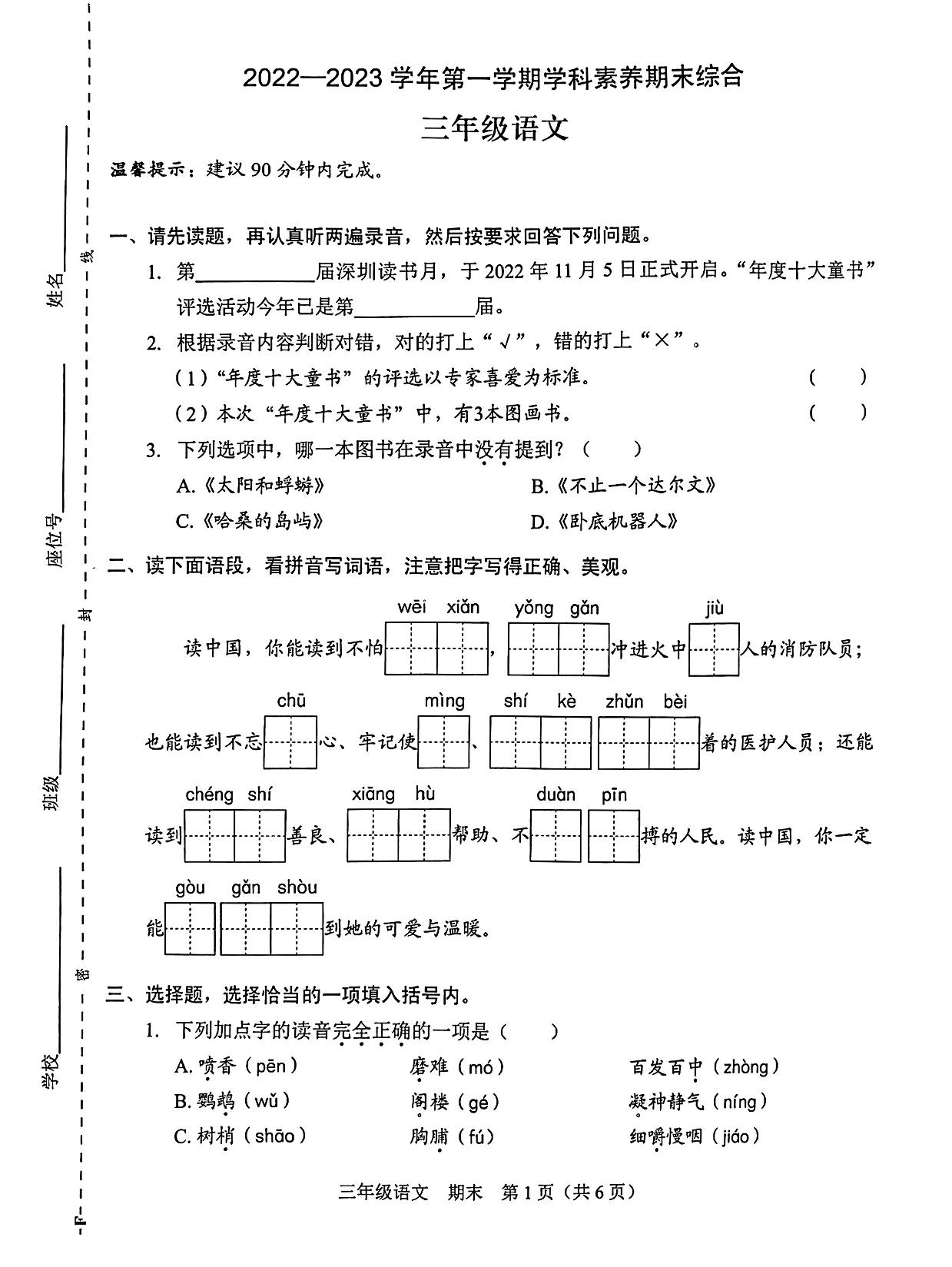 广东省深圳市福田区2022-2023学年第一学期学科素养期末综合试卷三年级语文(人教版)