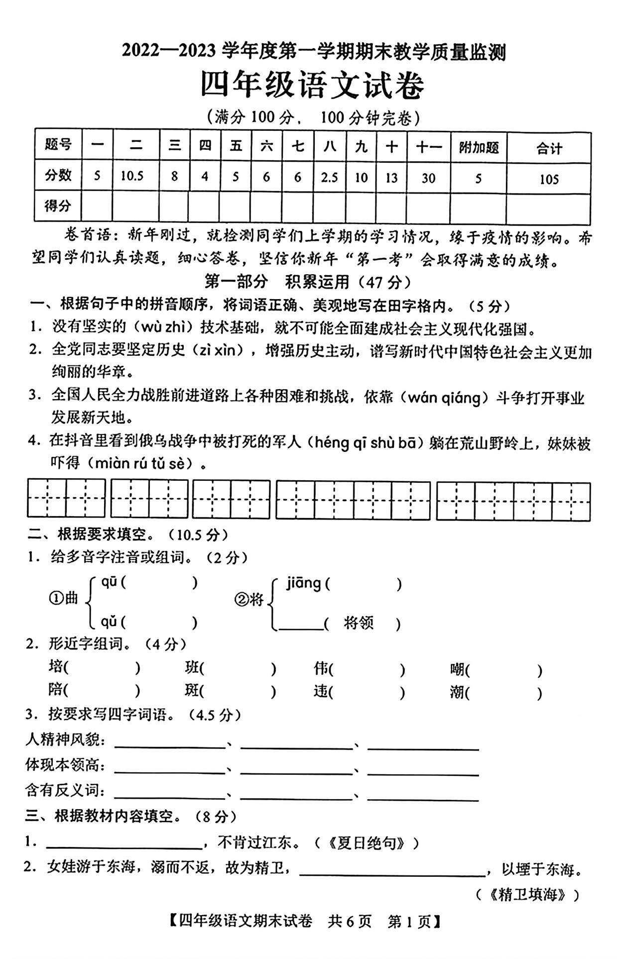 广东省湛江市麻章区2022-2023学年度第一学期期末教学质量监测试卷四年级语文(人教版)