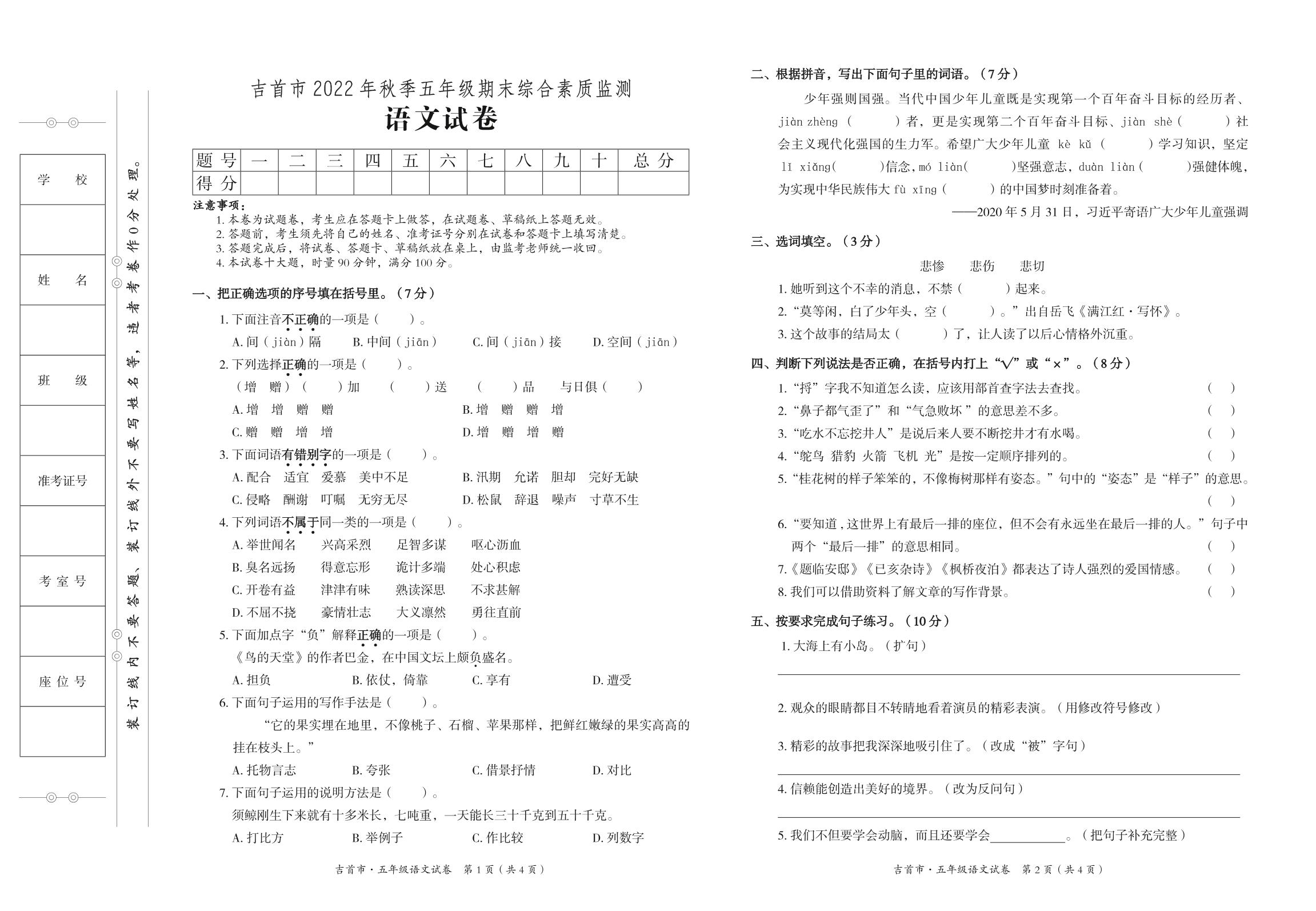 湖南省湘西土家族苗族自治州吉首市2022年秋季期末综合素质监测试卷五年级语文(人教版)
