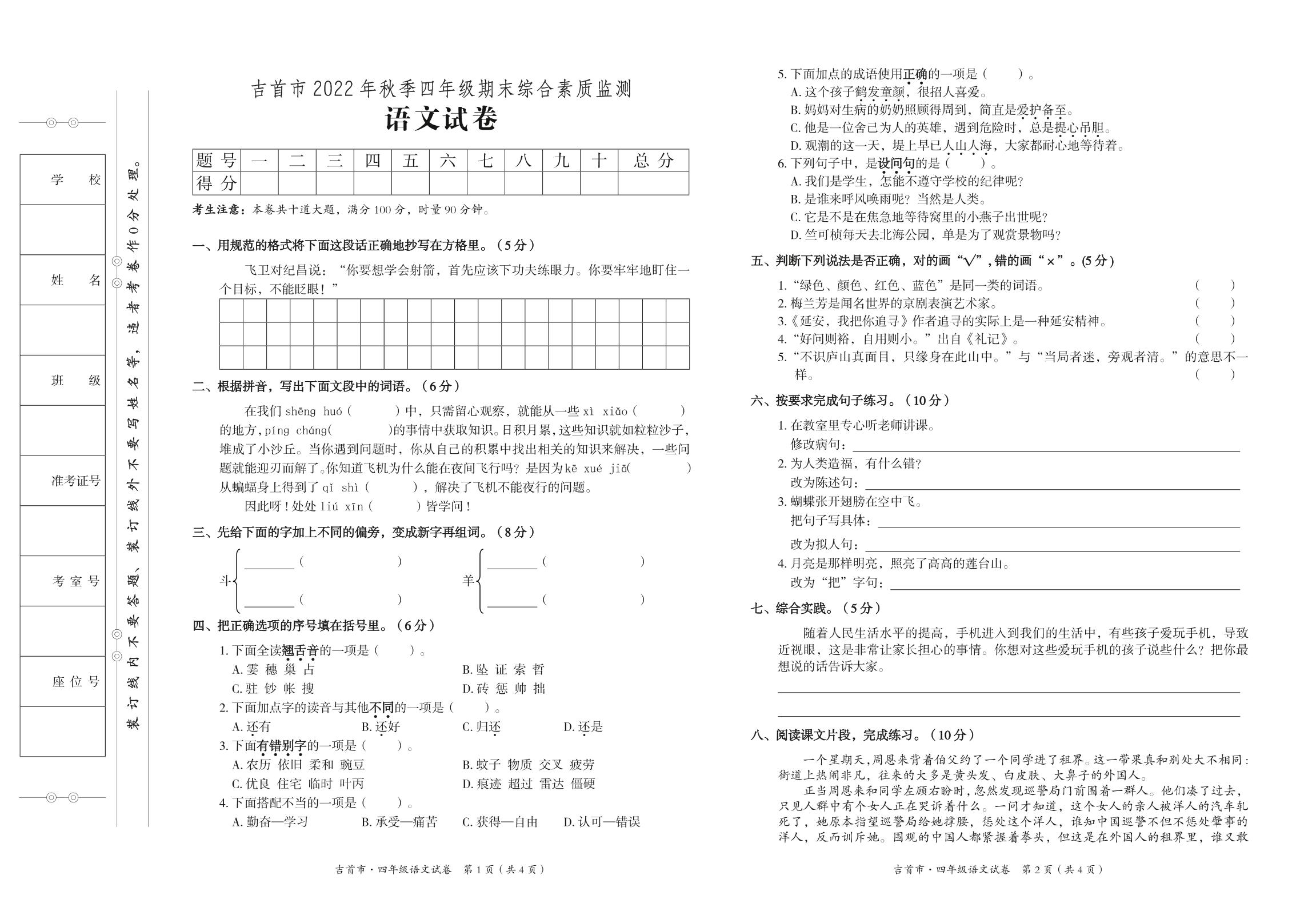 湖南省湘西土家族苗族自治州吉首市2022年秋季期末综合素质监测试卷四年级语文(人教版)