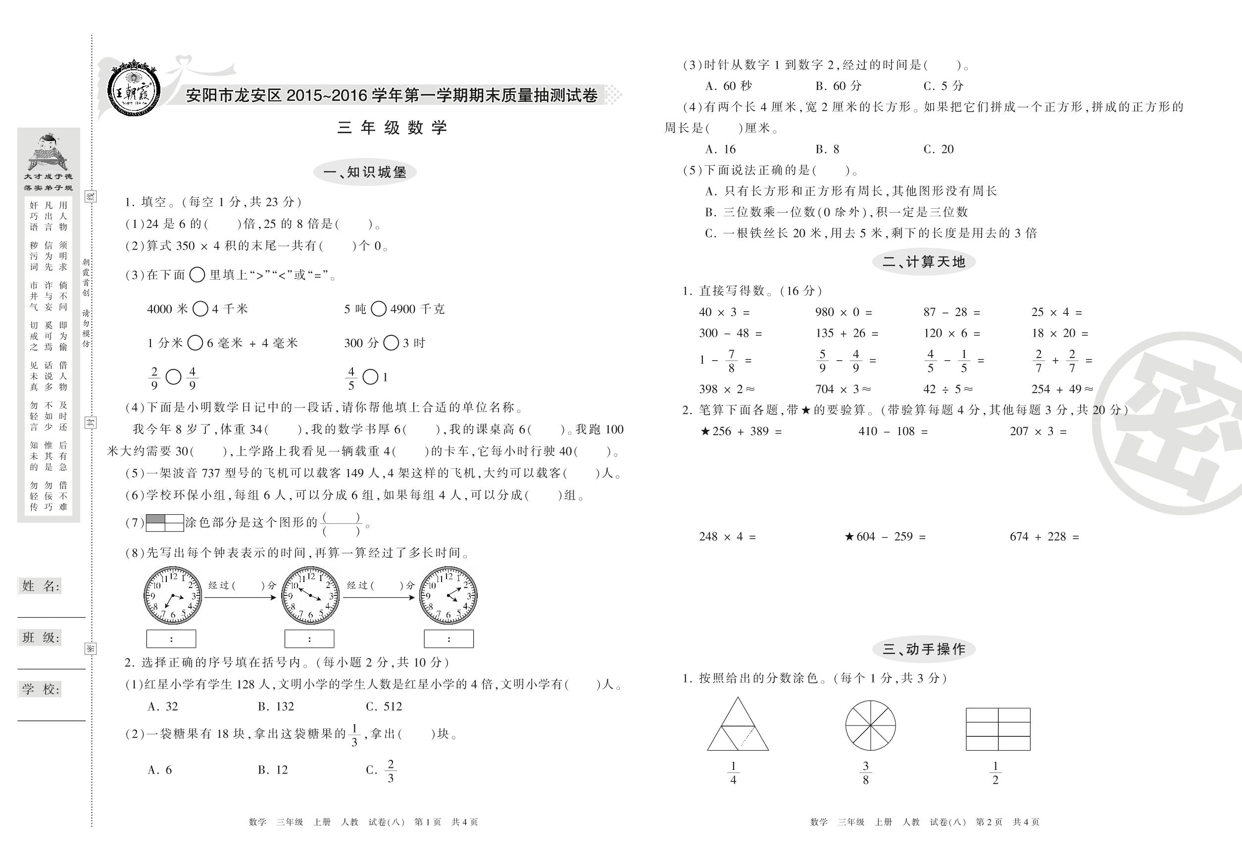 2015-2016学年第一学期安阳市龙安区三年级数学试卷(人教版)【8】