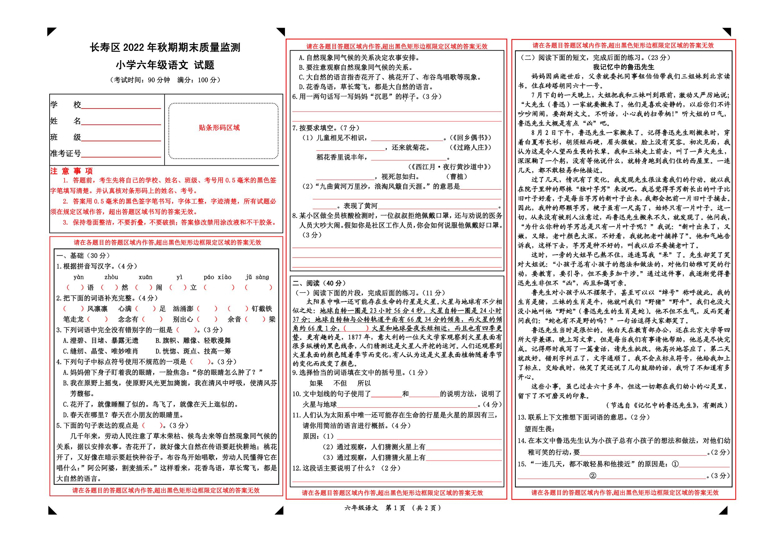 重庆市长寿区2022年秋期期末质量监测试题六年级语文(人教版)