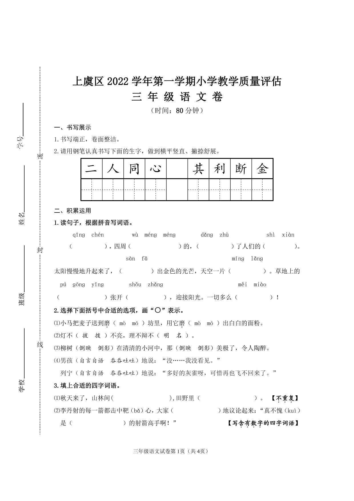 浙江省绍兴市上虞区2022-2023学年第一学期小学期末质量评估卷三年级语文(人教版)
