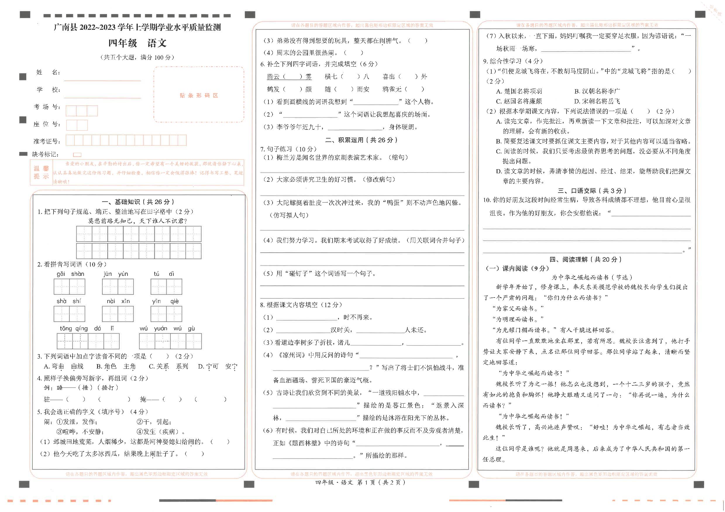 云南省文山壮族苗族自治州广南县2022-2023学年上学期期末学业水平质量监测试卷四年级语文(人教版)