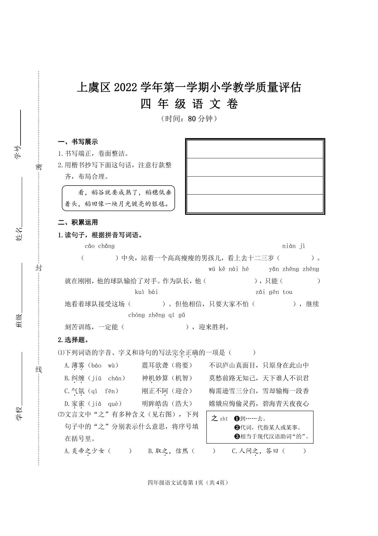 浙江省绍兴市上虞区2022-2023学年第一学期小学期末质量评估卷四年级语文(人教版)