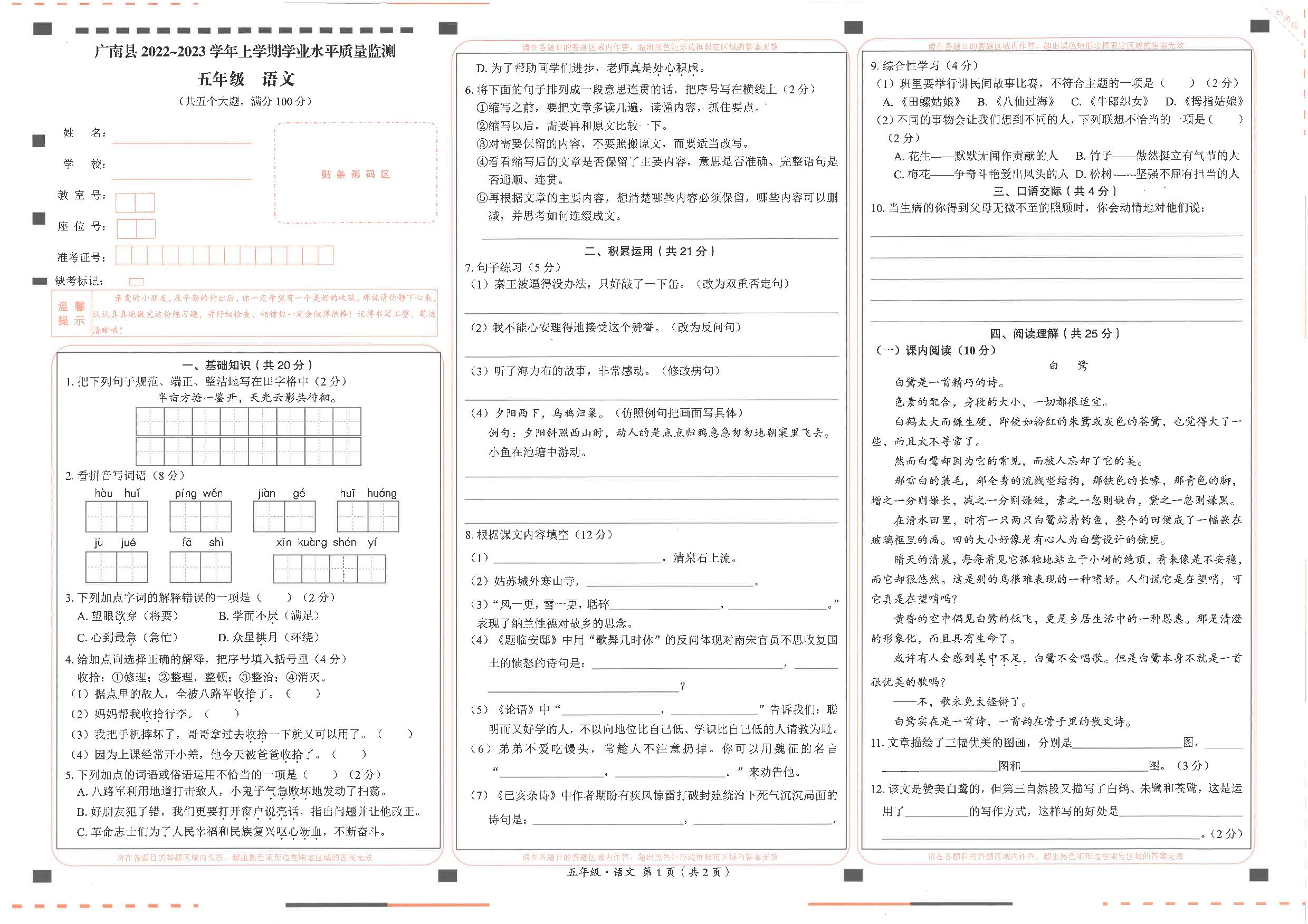云南省文山壮族苗族自治州广南县2022-2023学年上学期期末学业水平质量监测试卷五年级语文(人教版)