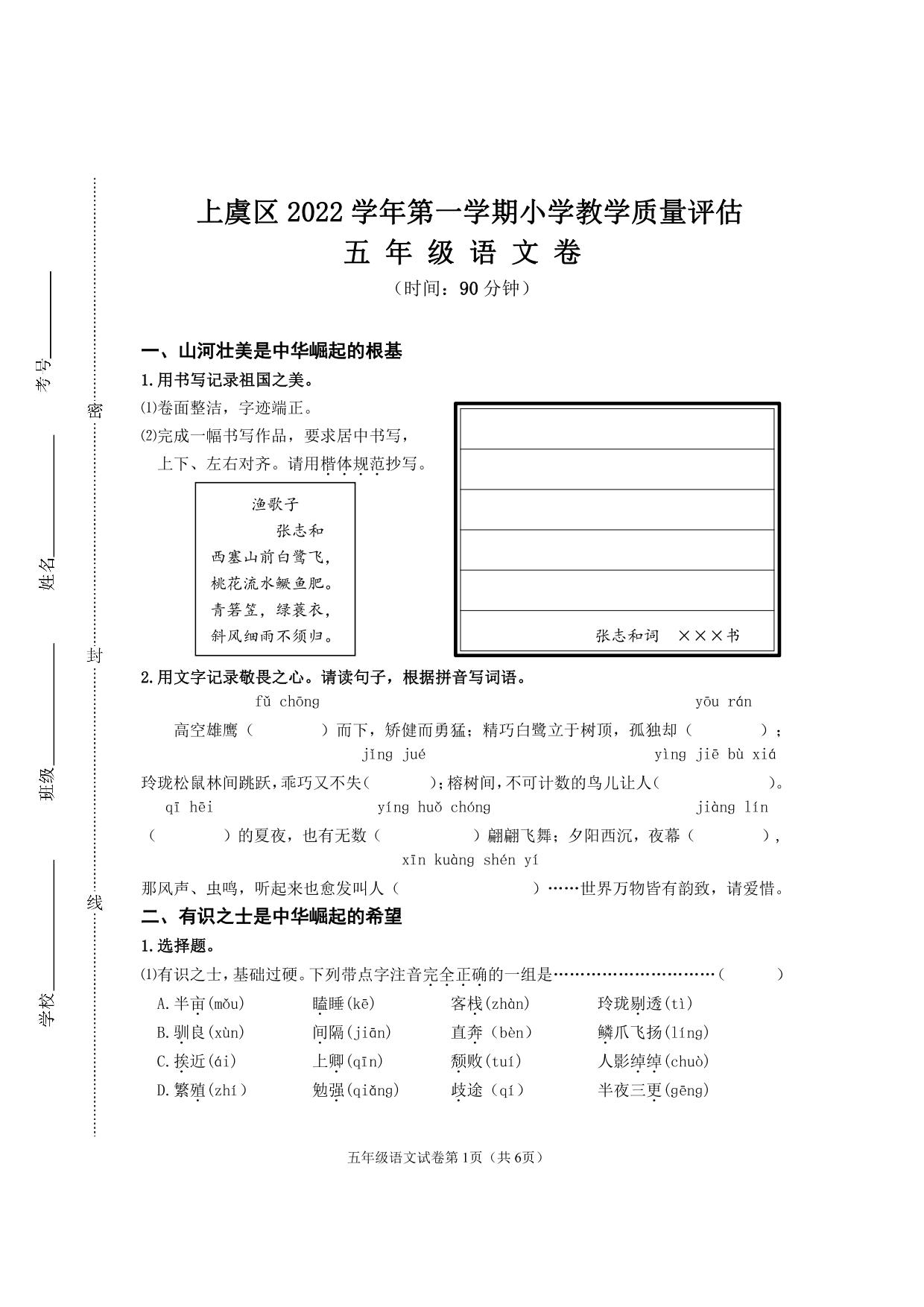 浙江省绍兴市上虞区2022-2023学年第一学期小学期末质量评估卷五年级语文(人教版)