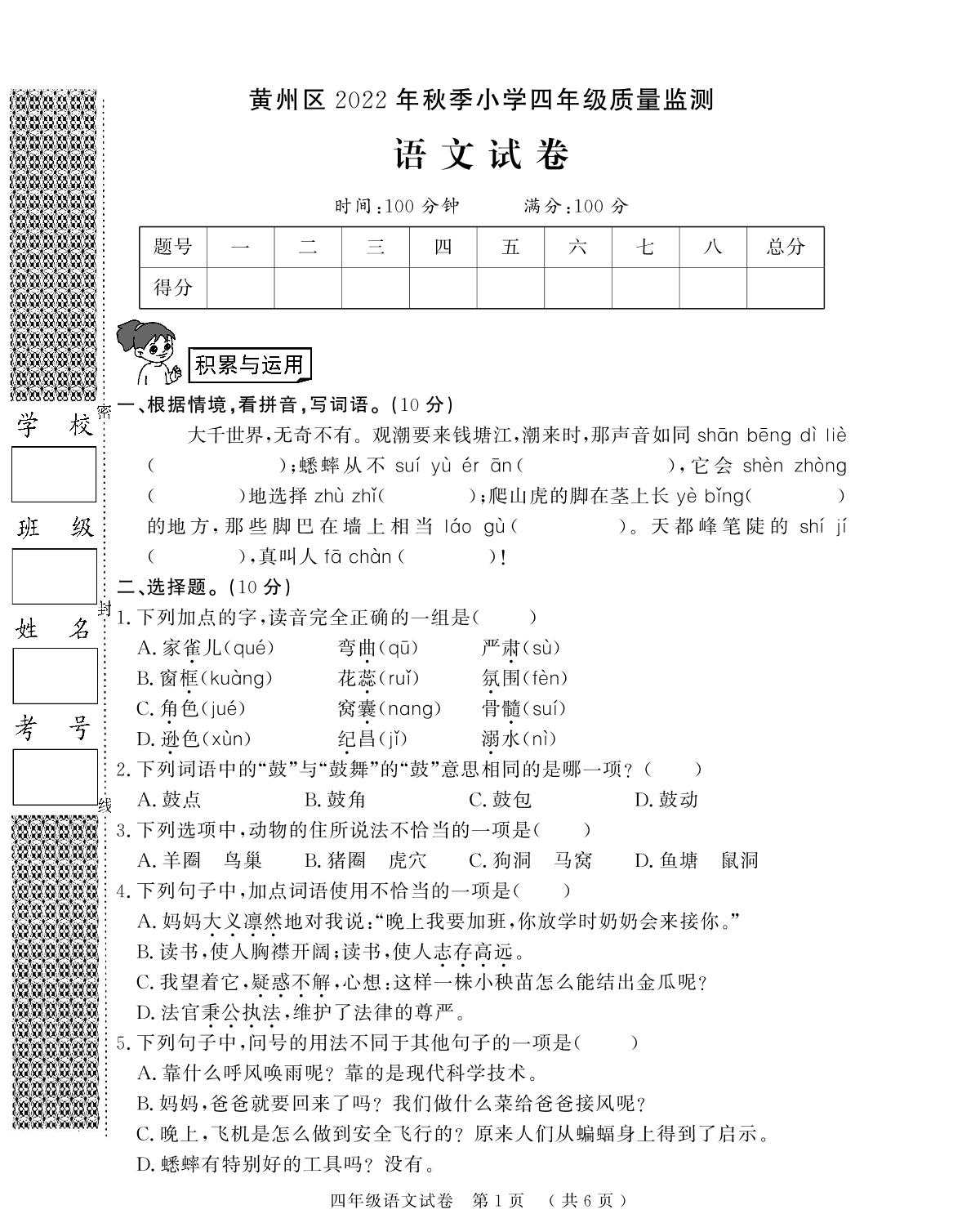 湖北省黄冈市黄州区2022年秋季小学期末质量监测试卷四年级语文(人教版)