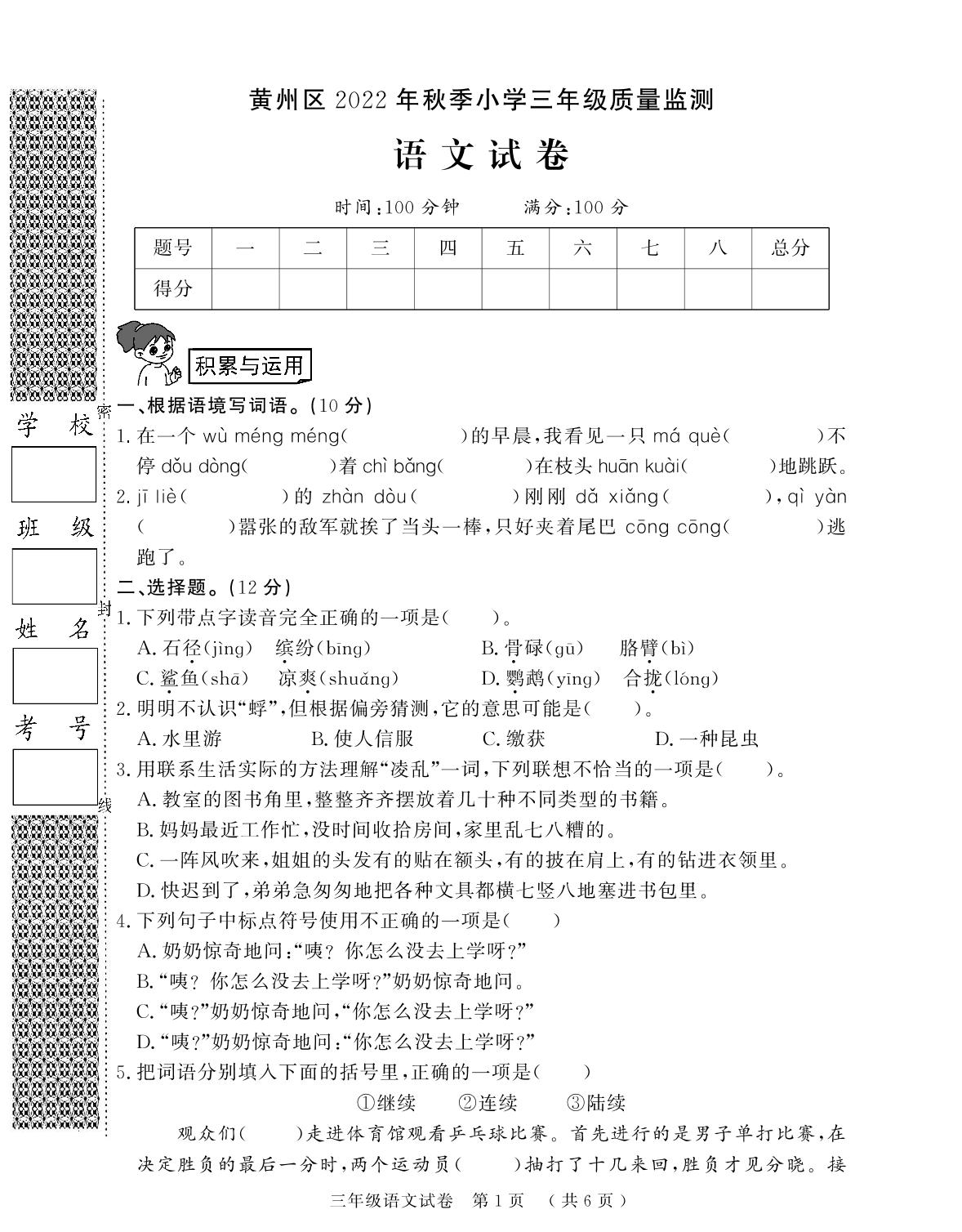 湖北省黄冈市黄州区2022年秋季小学期末质量监测试卷三年级语文(人教版)