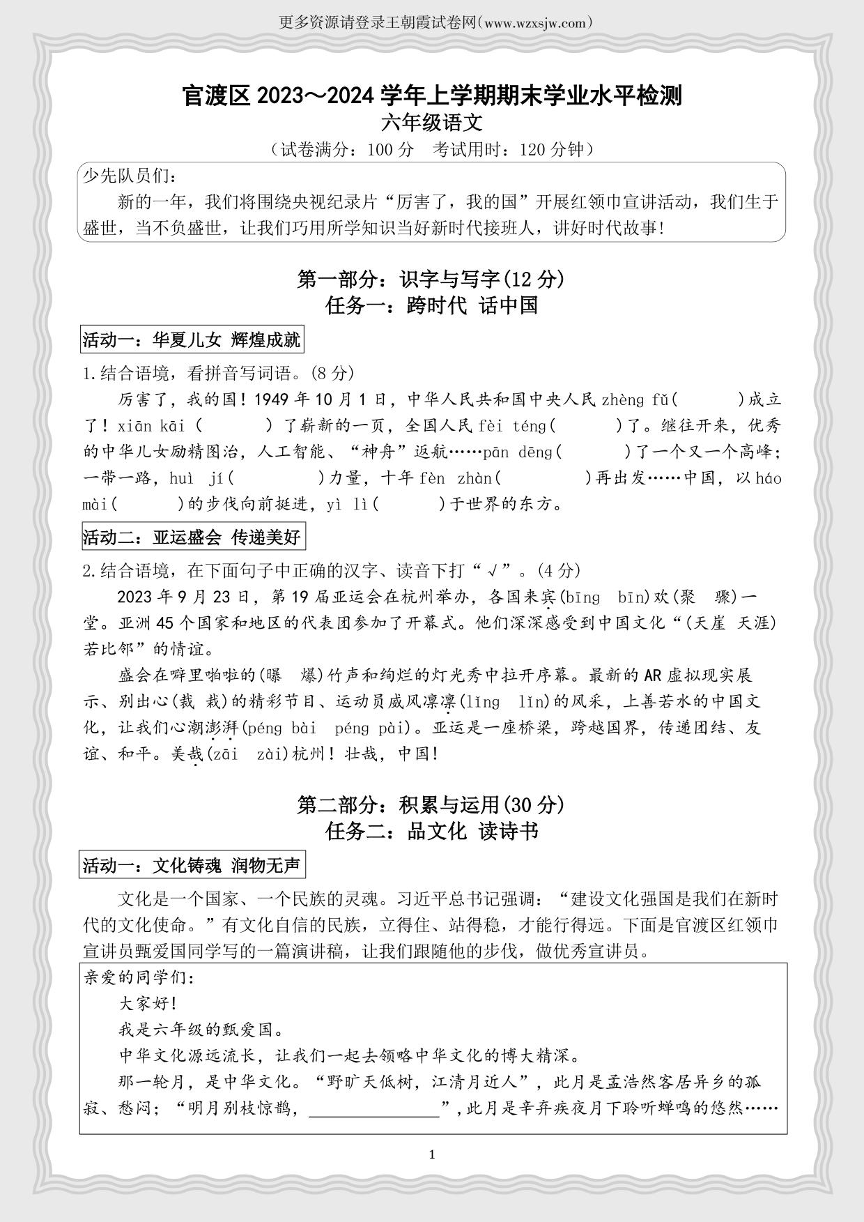 云南省昆明市官渡区2023-2024学年上学期期末学业水平检测试题六年级语文(人教版)