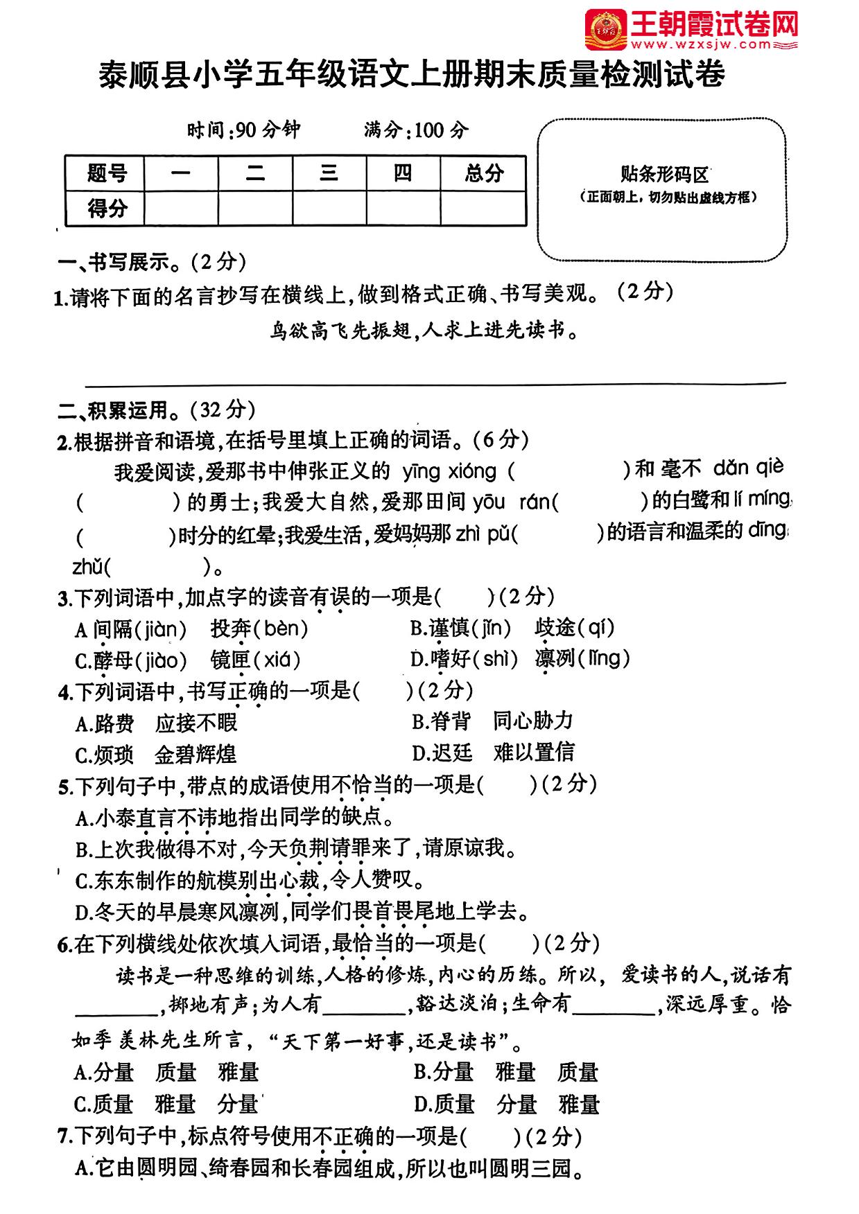 浙江省温州市泰顺县2023-2024学年上学期期末质量检测试卷五年级语文(人教版)