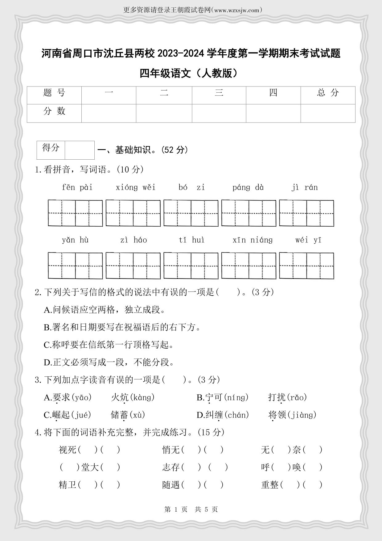 河南省周口市沈丘县两校2023-2024学年度第一学期期末考试试题四年级语文(人教版)