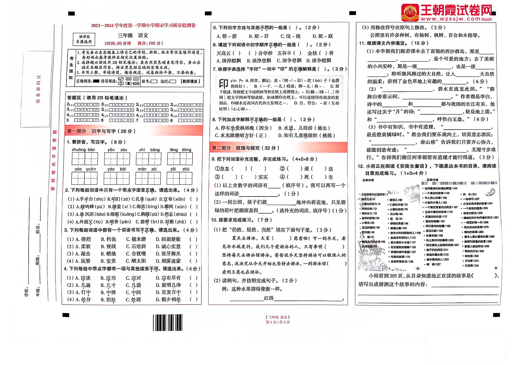 云南省昆明市五华区2023-2024学年度第一学期小学期末学习质量监测卷三年级语文(人教版)