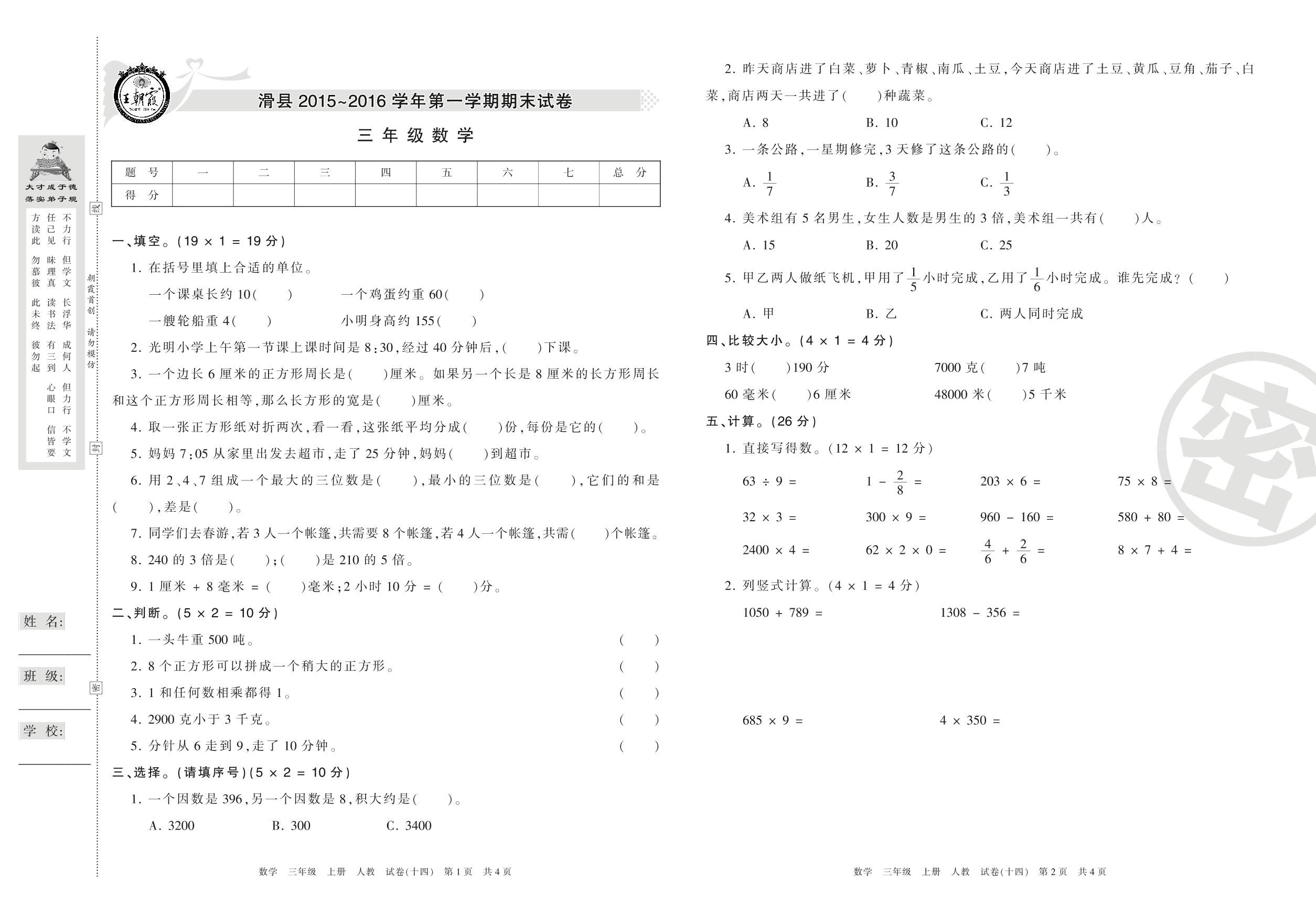 2015-2016学年第一学期安阳市滑县三年级数学试卷(人教版)【14】