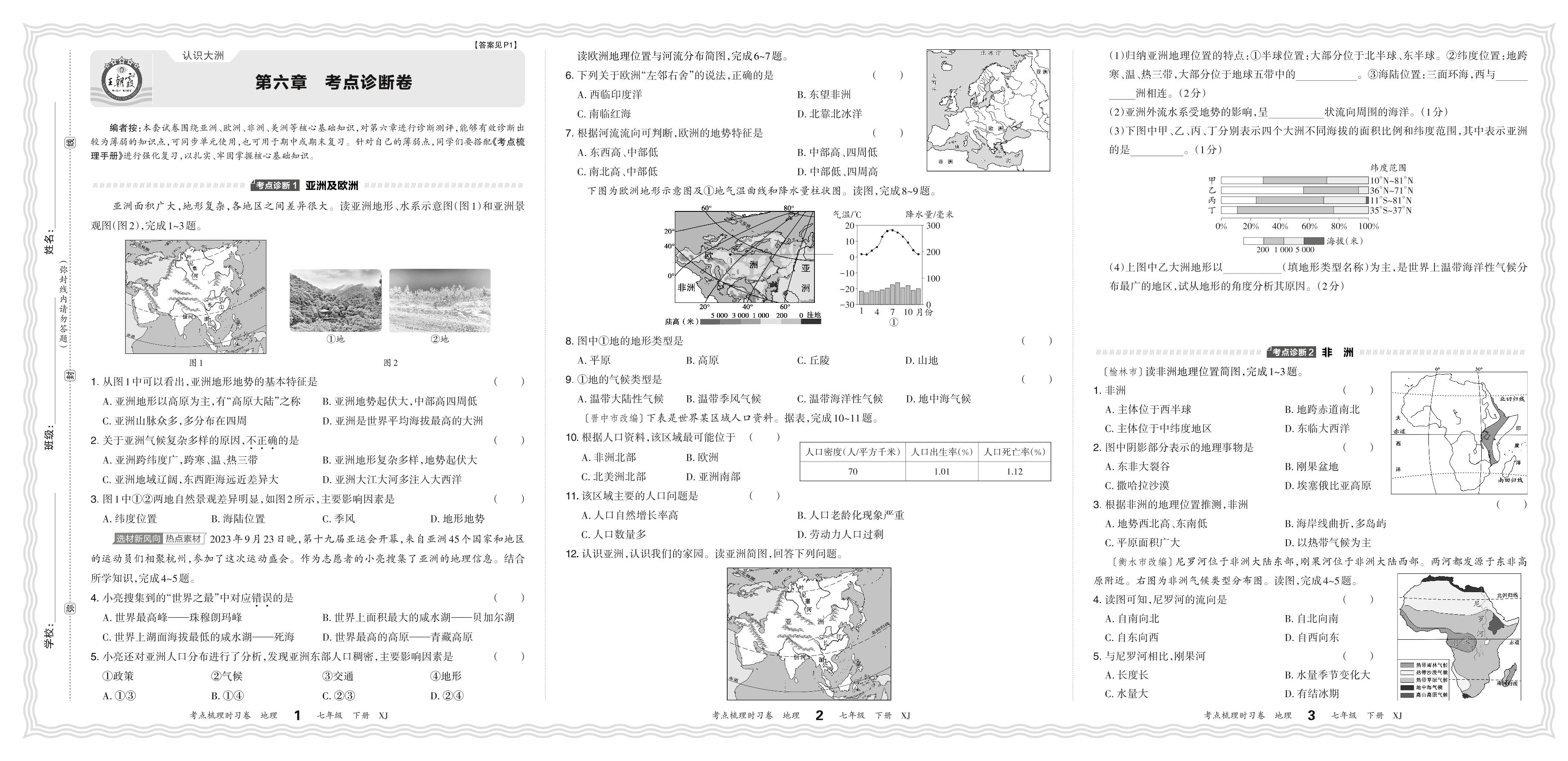 2024春下册七年级地理湘教版 第六章 考点诊断卷