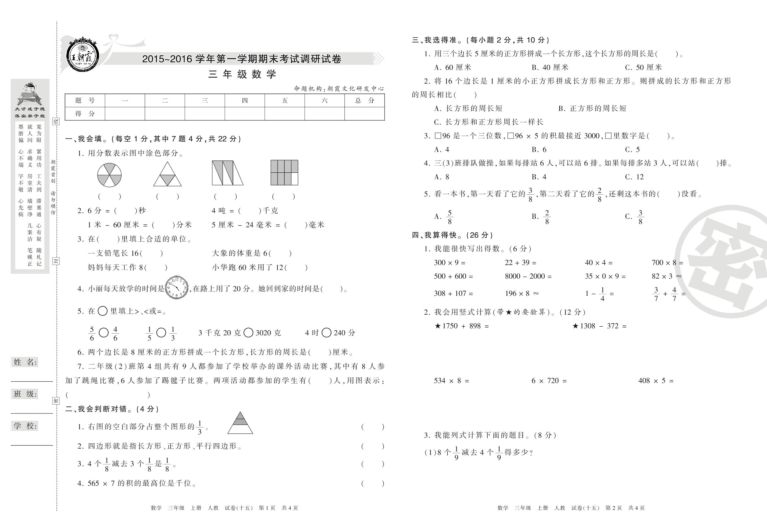 王朝霞期末调研卷三年级上册数学(人教版)【15】