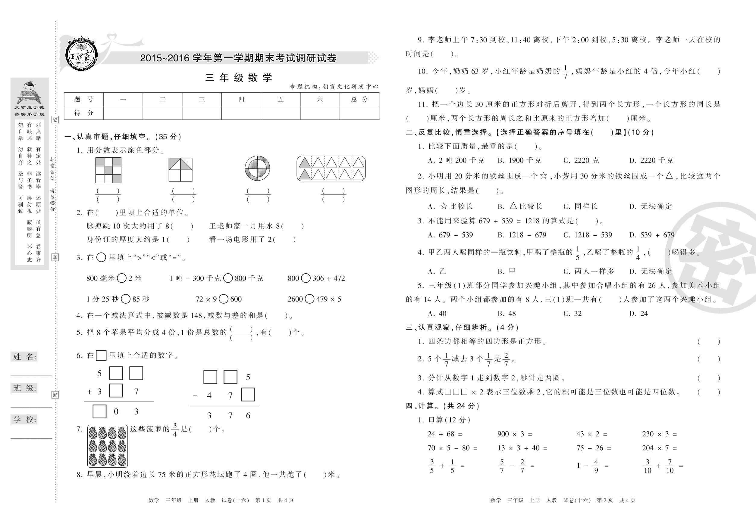 王朝霞期末调研卷三年级上册数学(人教版)【16】