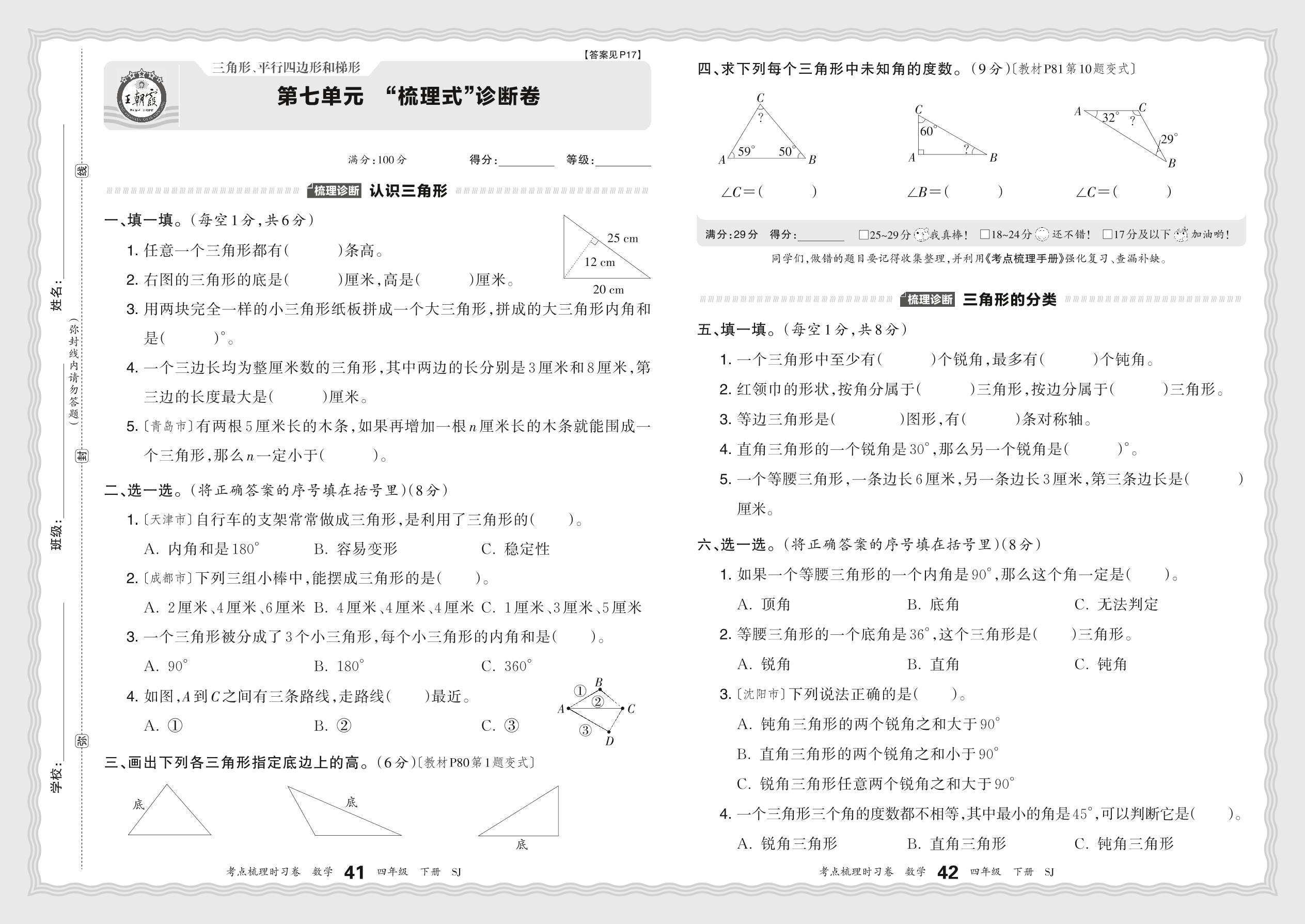 2024春下册四年级数学苏教版 第七单元 “梳理式”诊断卷