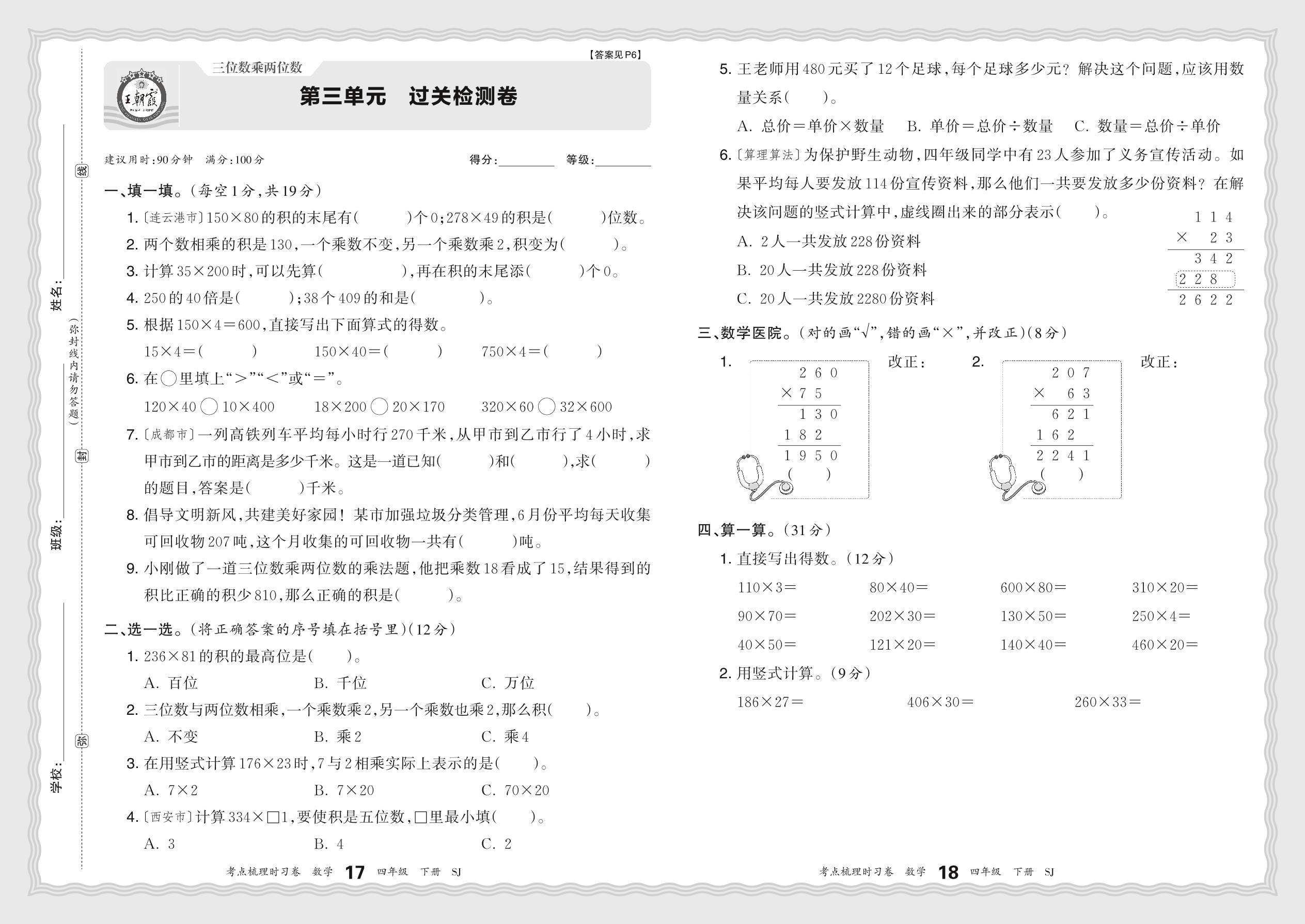 2024春下册四年级数学苏教版 第三单元 过关检测卷