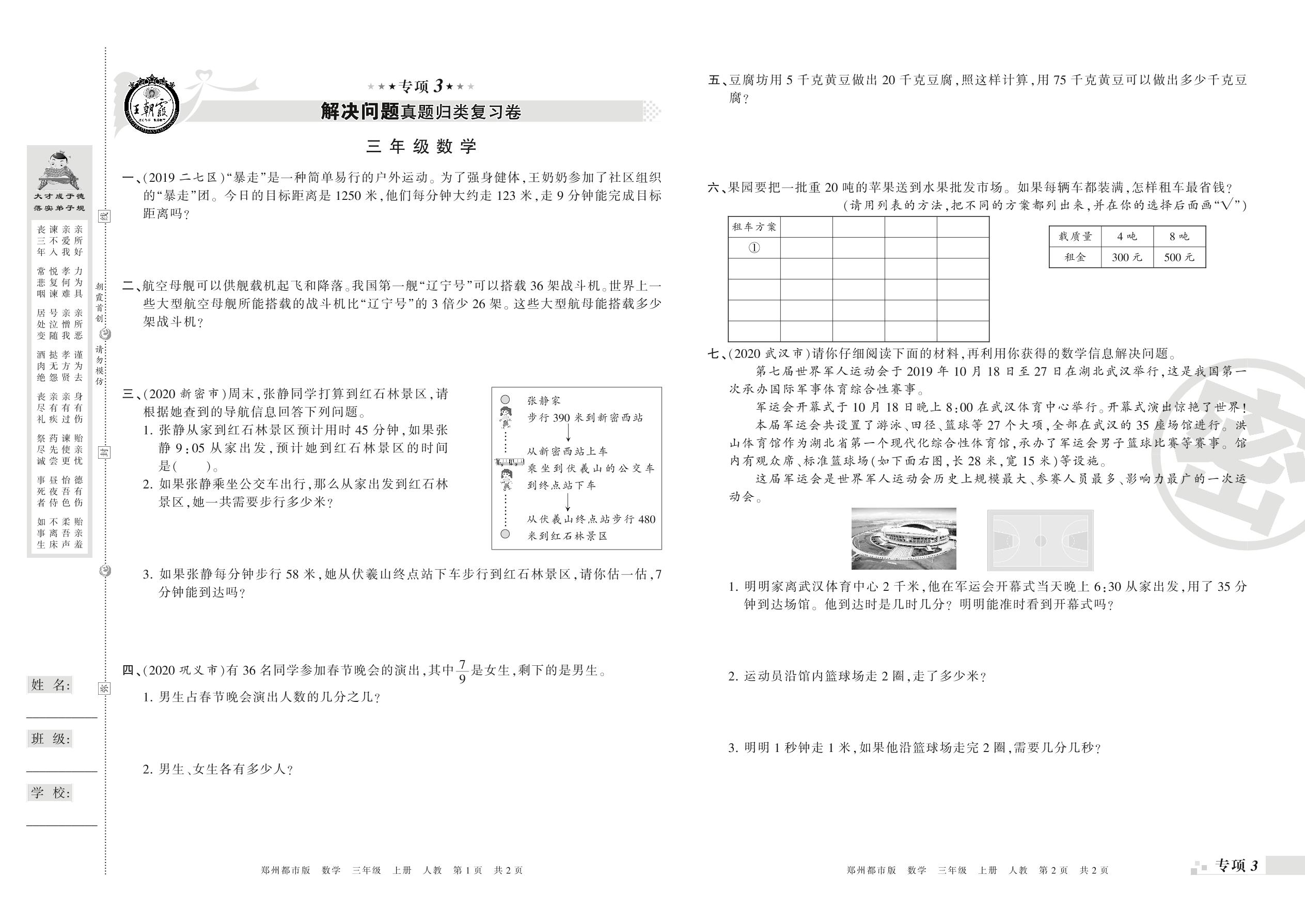 王朝霞期末专项卷——解决问题真题归类复习、新颖题速递:生活与数学三年级上册数学(人教版)_R21080492617【0】