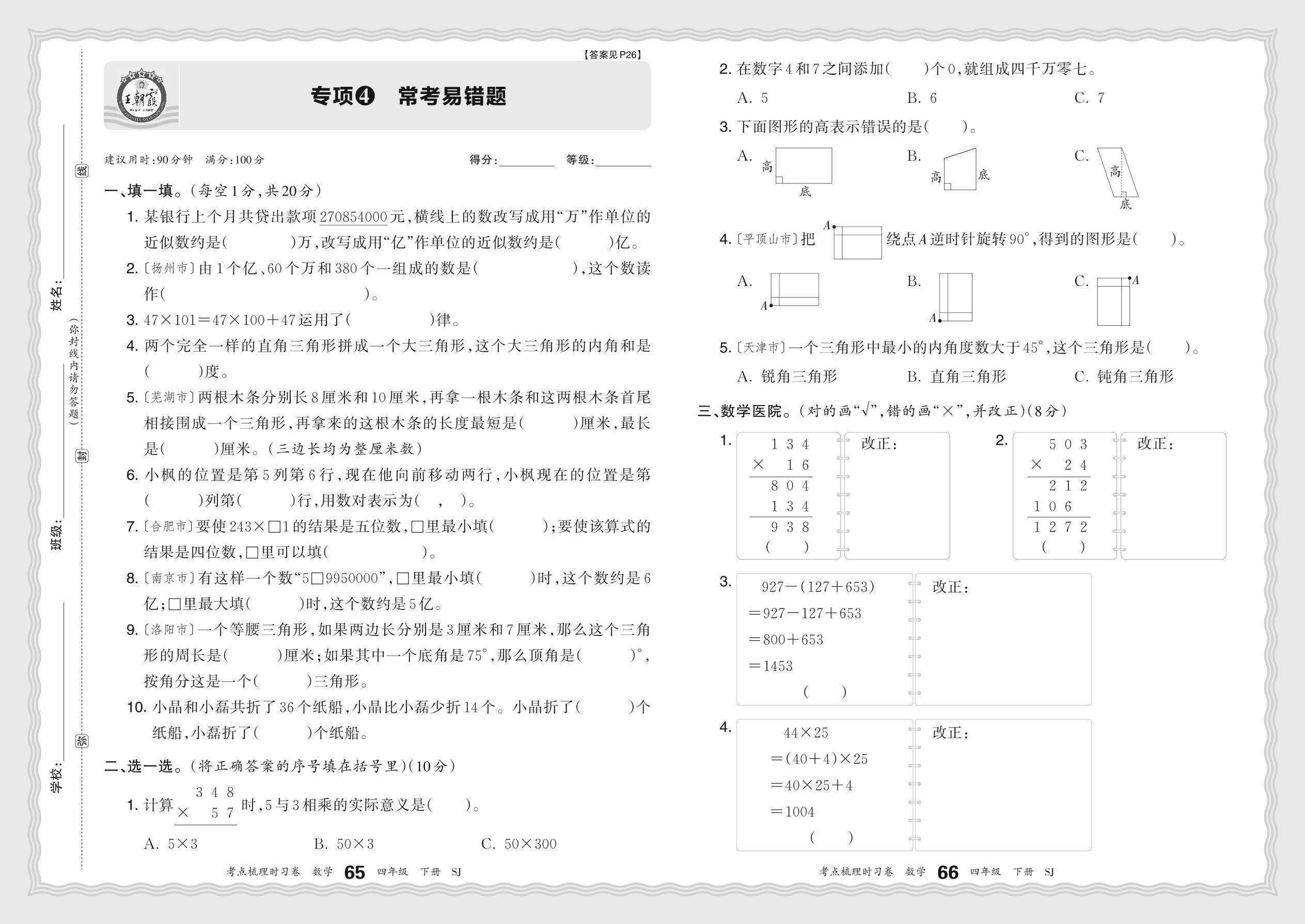 2024春下册四年级数学苏教版 期末专项卷KD版·常考易错题【4】
