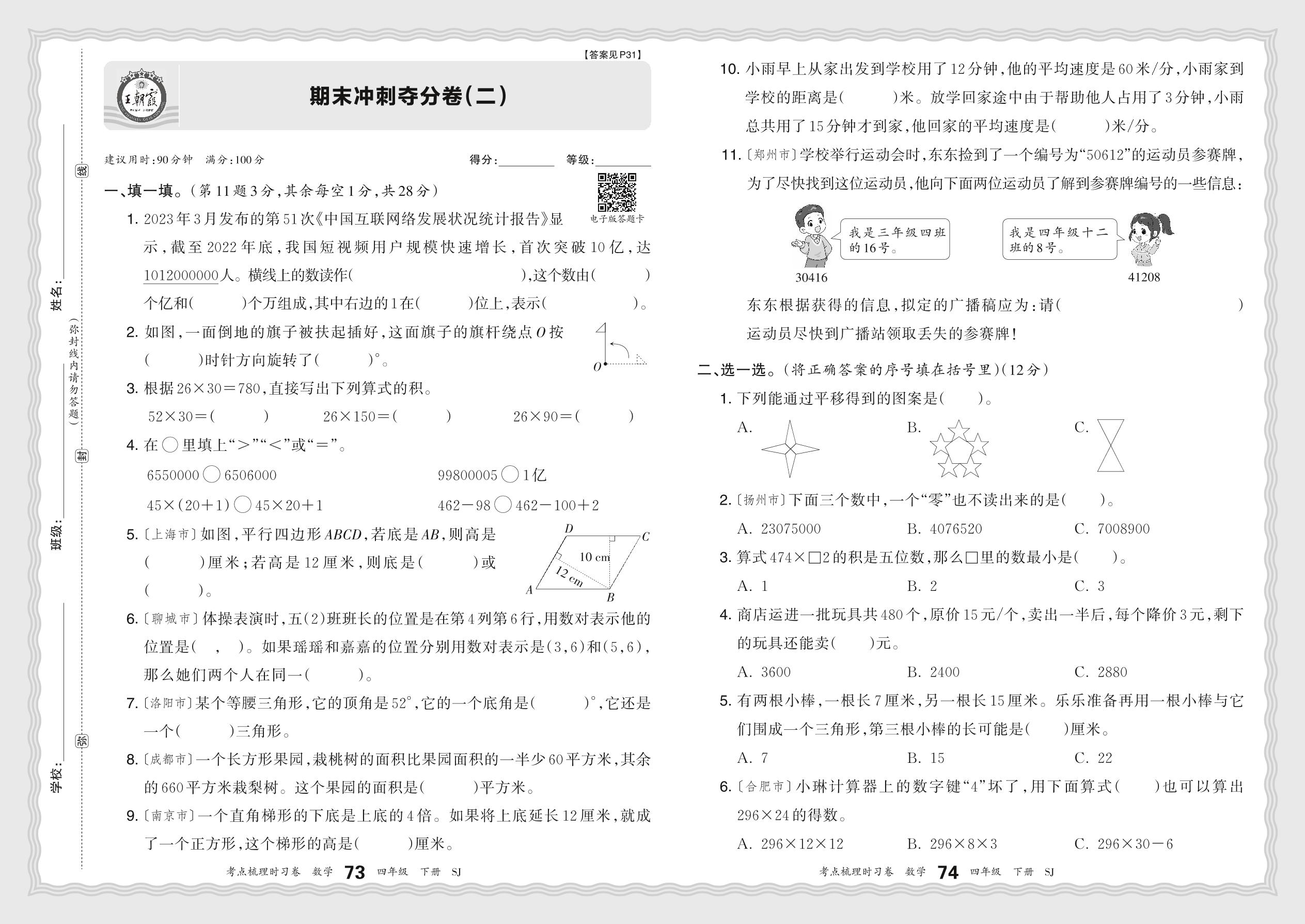 2024春下册四年级数学苏教版 期末冲刺夺分卷(二)