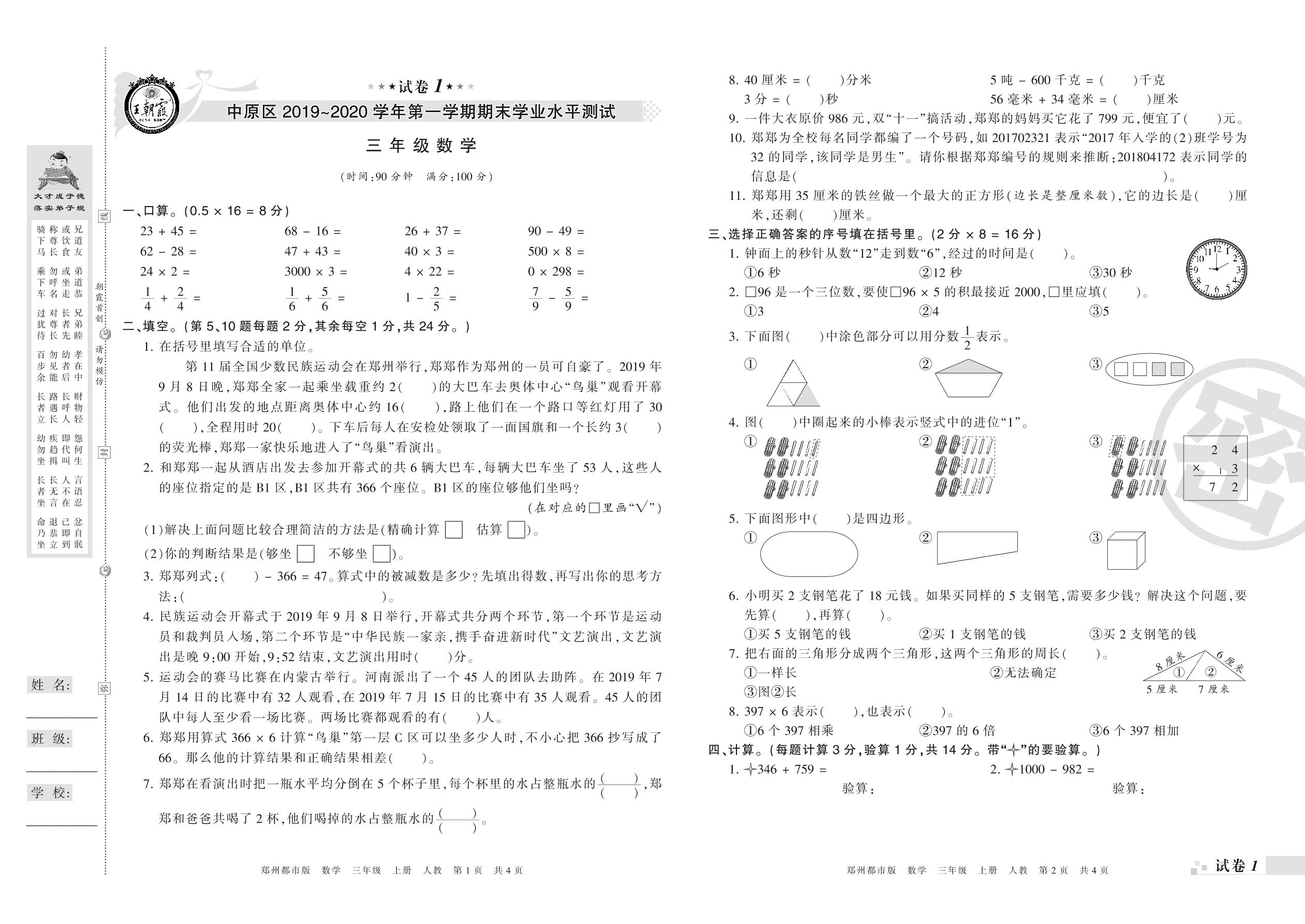 2019-2020学年第一学期郑州市中原区三年级数学试卷(人教版)【1】
