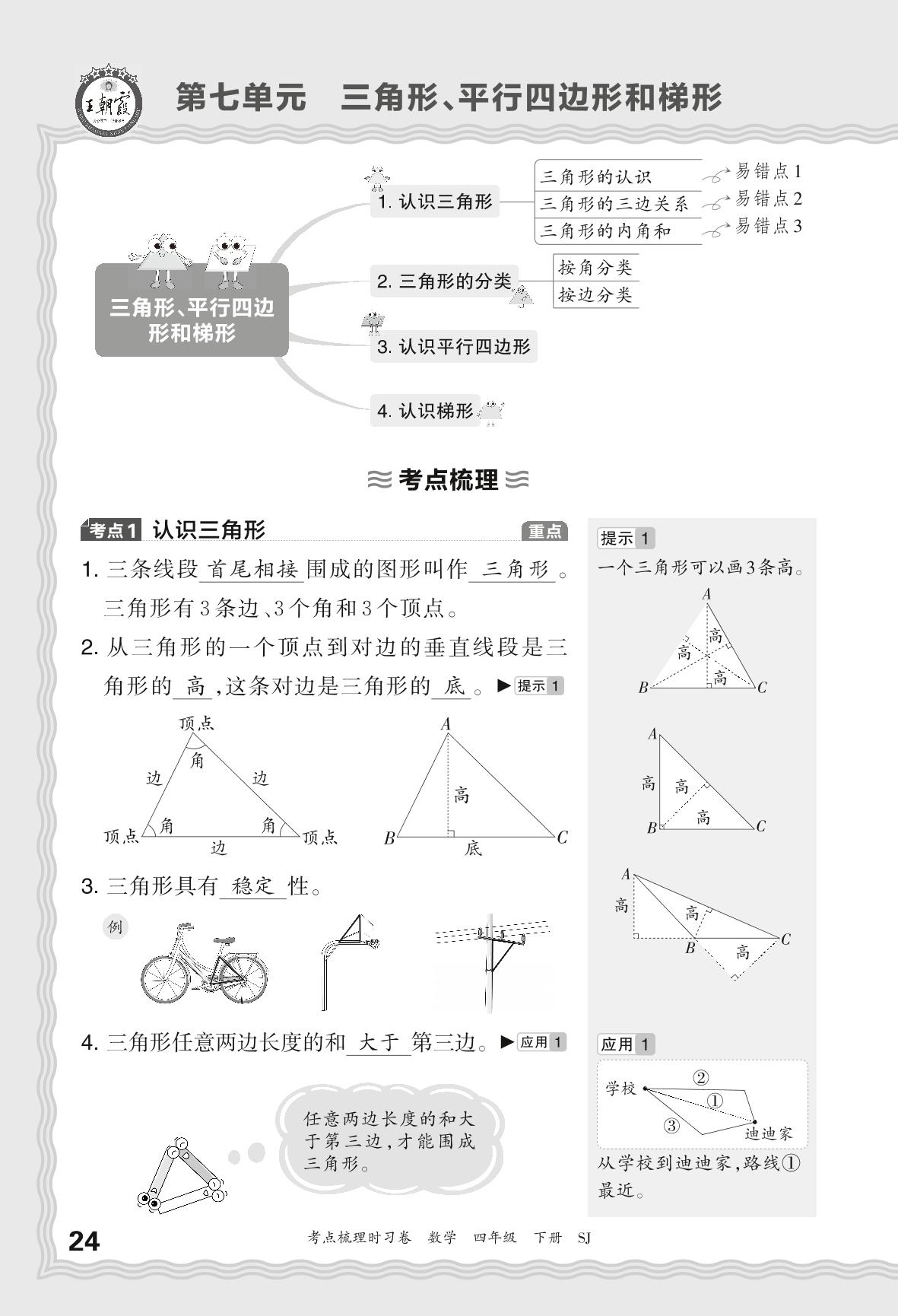 2024春下册四年级数学苏教版 考点梳理手册——第七单元 三角形、平行四边形和梯形