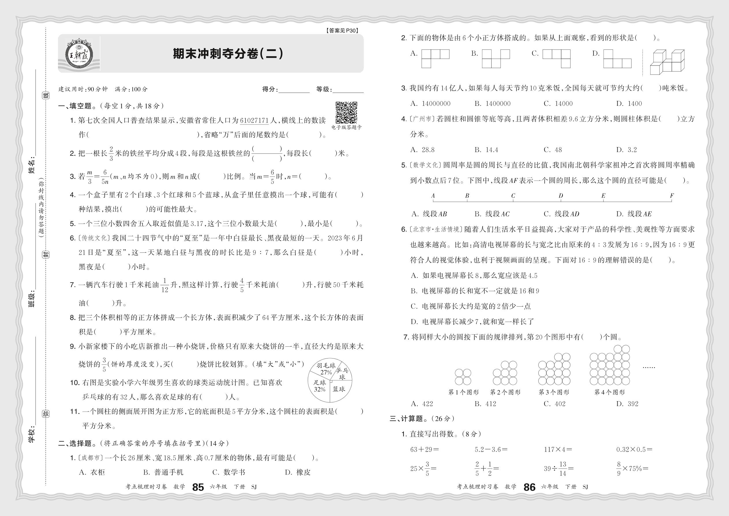 2024春下册六年级数学苏教版 期末冲刺夺分卷(二)