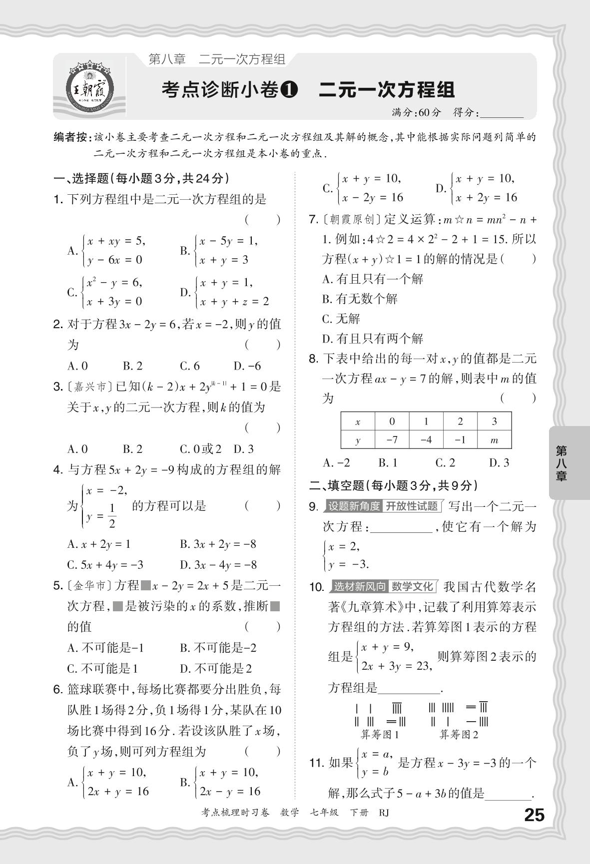 2024春下册七年级数学人教版 第八章 考点诊断小卷 二元一次方程组【1】
